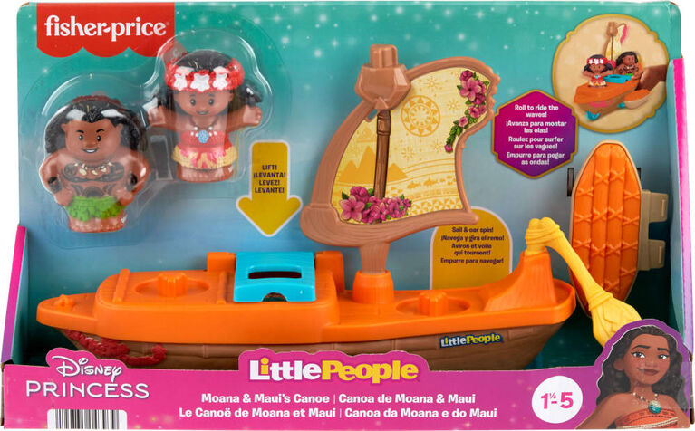 Young Disney fans can “set sail” on exciting adventures with Disney Moana and her pal, Maui, with this Little People toy boat and figure set from Fisher-Price. The push-along toy canoe features fun wave-like motion as kids roll it along, plus a pivoting sail, spinning oar and hatch that opens to reveal Heihei. Kids can place Moana and Maui on board and push to send the friends sailing along.