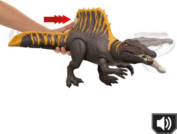 This Tail Thrasher Spinosaurus action figure with its authentic design and distinctive sail brings the excitement of Jurassic World Rebirth home. A button-activated dual attack provides side-to-side head action and chomp and a side-to-side tail swipe. The more times and faster the button is pressed, the greater the fierceness of the attack! Movable joints and movie-accurate design make this dinosaur figure ready for battle moves and poses. Scan the Tracking Code on the dinosaur’s foot in the free Jurassic World Play App with a compatible smart device (Android or iOS, not included) to unlock a digital version of the dinosaur and play the fiercely fun game to race various vehicles on land, air and sea. Makes a great gift for dinosaur fans ages 4 years and up. Colors and decorations may vary.