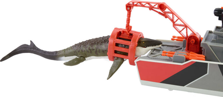 Mattel Matchbox Jurassic World Mosasaurus Rescue Action Boat Playset with Ship, Dino, Toy Car & Missiles