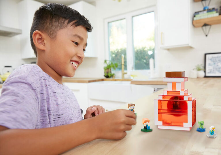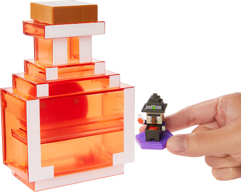 Now you can store and carry the perfect collection of Minecraft Boost Mini Figures in an exciting new case! Shaped like in-game potion, the Minecraft Carry-Along Potion is the perfect case to hold, display, and carry up to 5 Boost Mini Figures, including our classic Mini Figures that sit right on the shelf. And Boost Minis — NFC-enabled Mini Figures that unlock a temporary boost for your character in the Minecraft augmented reality Earth mobile game — slide right into place in the case’s designated grooves. Minecraft fans will be proud to display all their Minis in this versatile display case that clips easily onto a belt, a pocket, or a backpack! Rotate the cap to lock and unlock the potion pack. A great gift for Minecraft fans. Case comes with an exclusive Potion-Brewing Witch Boost Mini Figure! Colors and decorations may vary. Other Mini Figures sold separately.