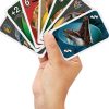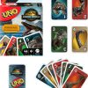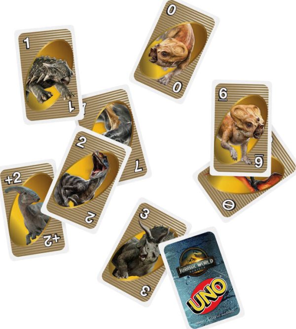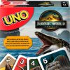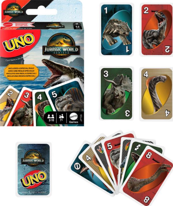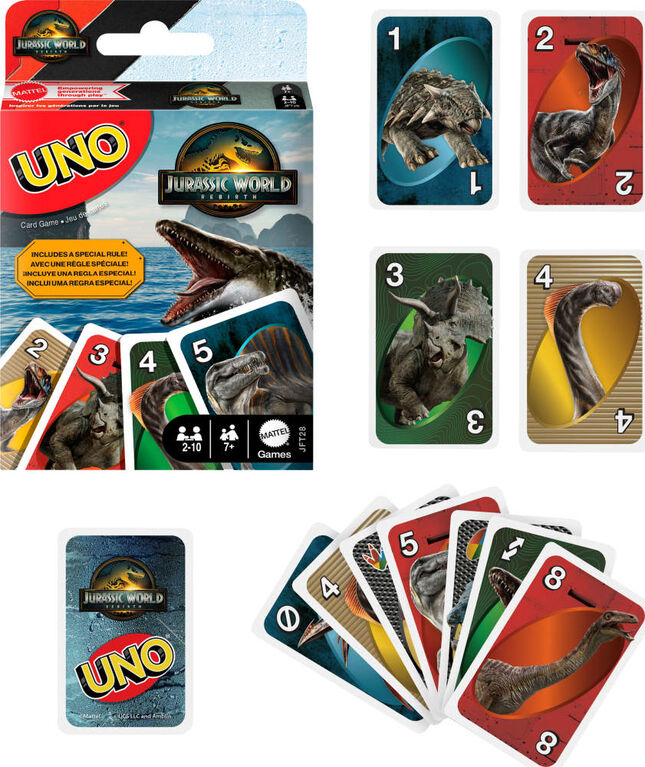 Fans of Jurassic World Rebirth will love playing with this themed UNO card game. With a deck featuring graphics inspired by favorite characters and scenes, players try to match colors and numbers — there’s even a special ‘Attack of the T. Rex’ rule that will have somebody drawing five cards! And when down to a last card, don’t forget to snarl ‘UNO!’ Makes a great gift for fans of Jurassic World Rebirth and card game lovers ages 7 years old and up. Colors and decorations may vary.