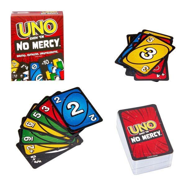 The Mattel UNO No Mercy card game takes classic UNO to a whole new level with intense twists and ruthless strategies. Players can stack, swap, and force unexpected draws, making every round unpredictable. Win by shedding all your cards or knocking out opponents. Designed for 2-6 players ages 7+, this fast-paced game is perfect for family nights and gatherings. Includes 168 cards and easy-to-follow instructions.