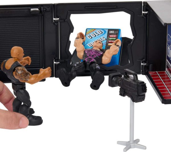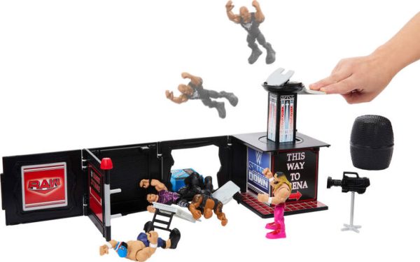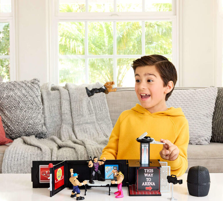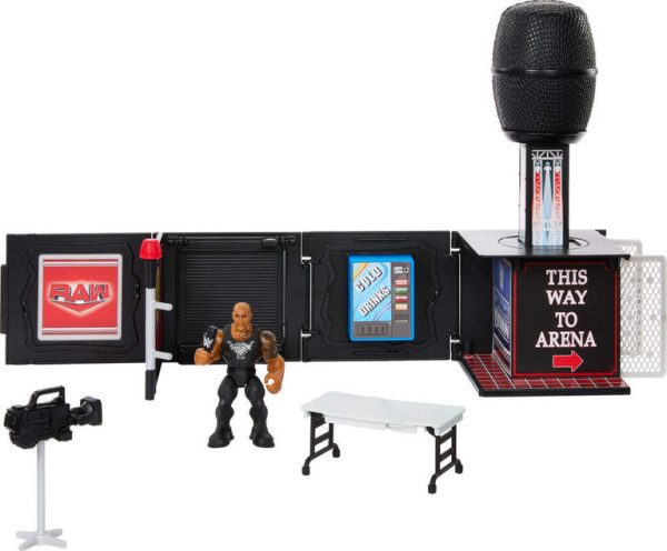 Bring the WWE mayhem backstage with 2-in-1 Knuckle Crunchers The Rock Final Boss Microphone playset with action figure, two accessories and breakaway action! The kid-sized microphone flips open into a backstage diorama for play and display. The Rock is ready to dominate the airwaves standing 3.25 inches tall with joints that make bone-crunching sounds when moved. A breakaway table and camera add to the action on set. With a fist full of fighting accessories, bone-crunching sounds and breakaway action, this set delivers the crunch for fans and kids ages 6 years and older. Colors and decorations may vary.