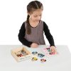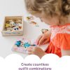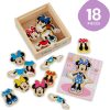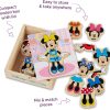 - Mix-and-Match Dress-Up Fun – Includes 18 wooden pieces to dress up Minnie Mouse with fun outfit and bow combinations, displayed on a scene printed inside the storage box lid.