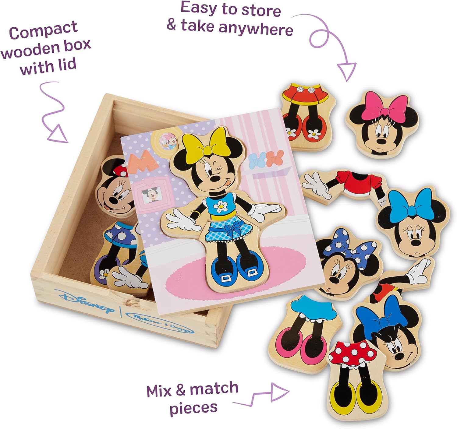 - Mix-and-Match Dress-Up Fun – Includes 18 wooden pieces to dress up Minnie Mouse with fun outfit and bow combinations, displayed on a scene printed inside the storage box lid.