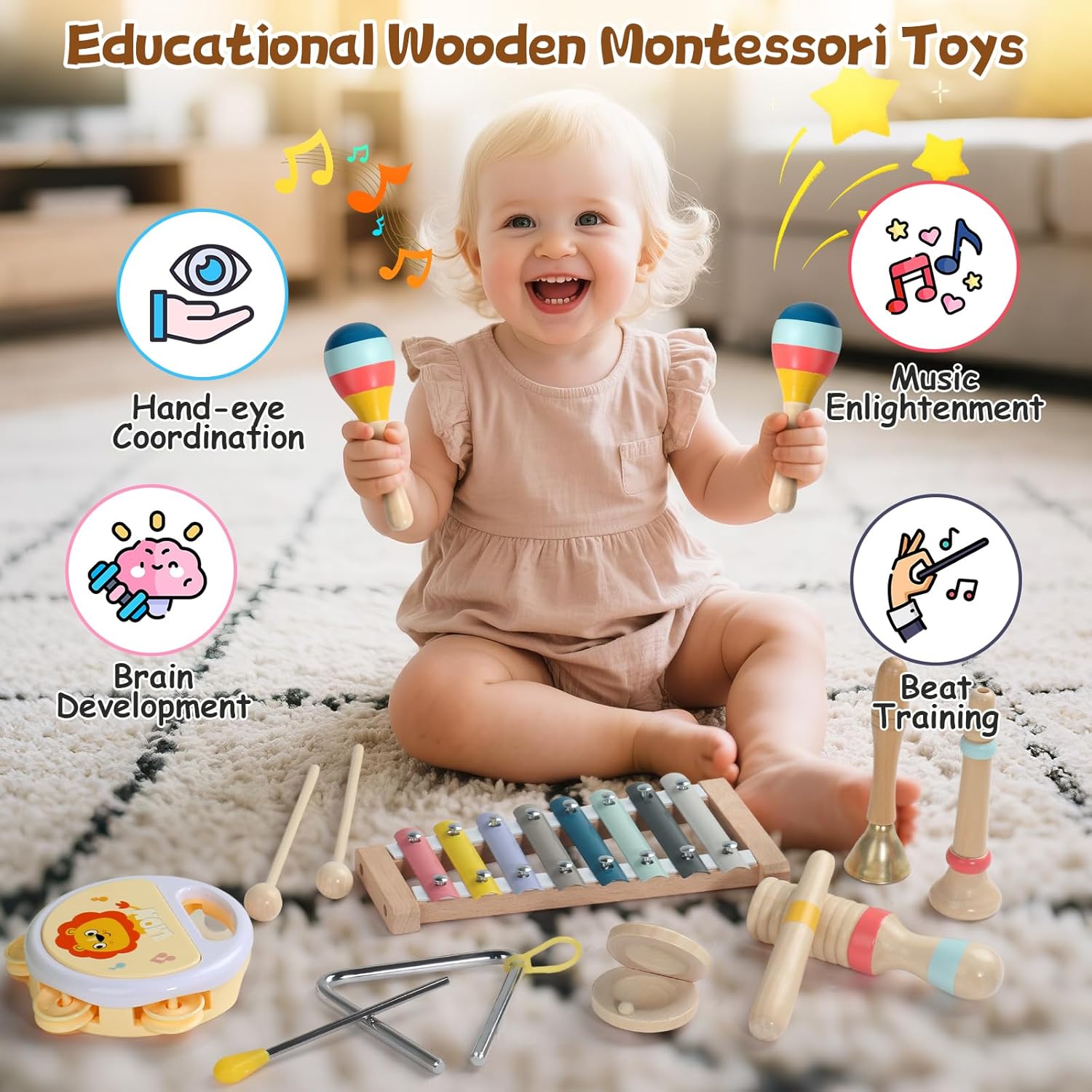 - 8+1 Montessori Toys for 1 Year Old: Our 1 year old girl toys is designed for babies who love Montessori instruments. The toys for 1 year old boys girls include a xylophone, triangle, percussion stick, castanets, clarinet, small bell, threaded single bell, maracas, a storage bag, and a free one-piece tambourine. Through tapping, shaking, and clapping, the various instruments stimulate baby's rhythmic recognition and are the first step in nurturing their musical potential!