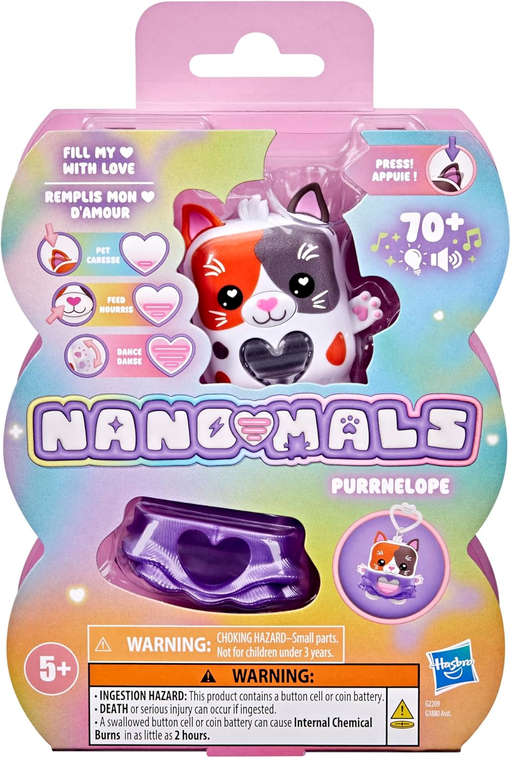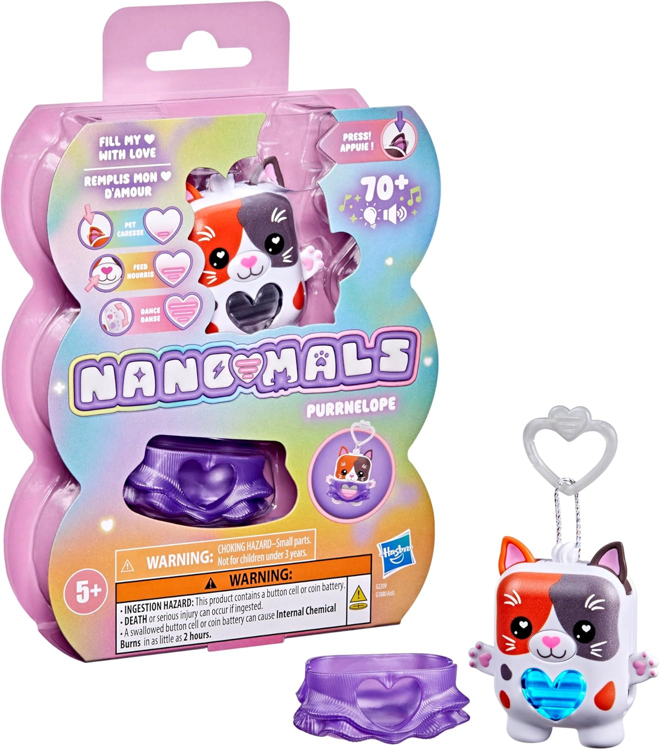 Meet the Nano-mals, an adorable collection of fidgety pets that need your love and care! Each Nano-mals character has an electronic heart meter — can you find out what your Nano-mal needs to keep their heart full? Pet, dance, feed, catch, flip, and shake to help your Nano-mal’s heart meter rise. You did it! Celebrate with a song and lights show! Love and care for your Nano-mal again and again, and even play with other Nano-mals to unlock bonus interactions. (Sold separately. Subject to availability.) Accessorize with colorful textured outfits and even take your Nano-mals friends on the go with an attached clip. Look for a variety of Nano-mals characters featuring kid-favorite animals just waiting to be loved!