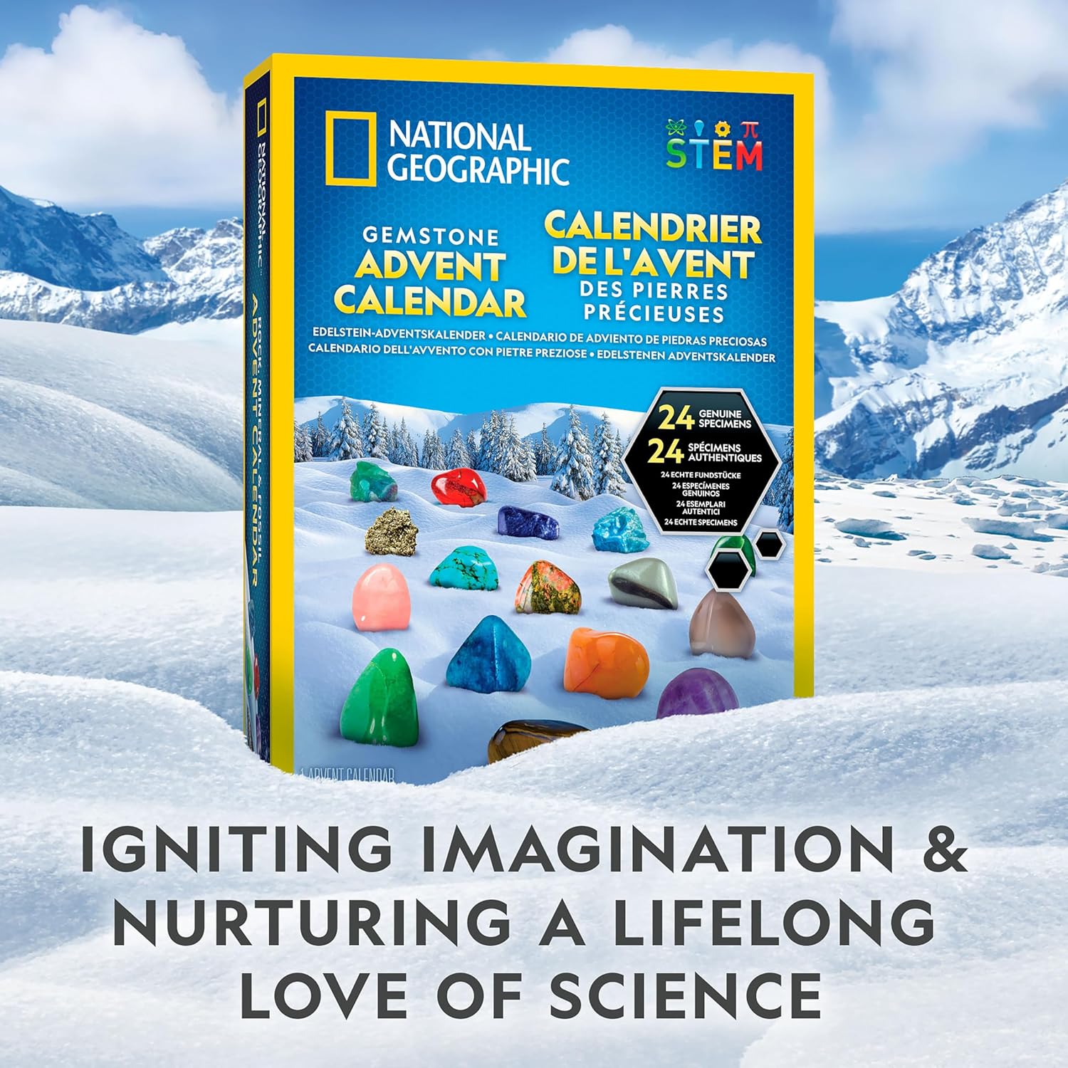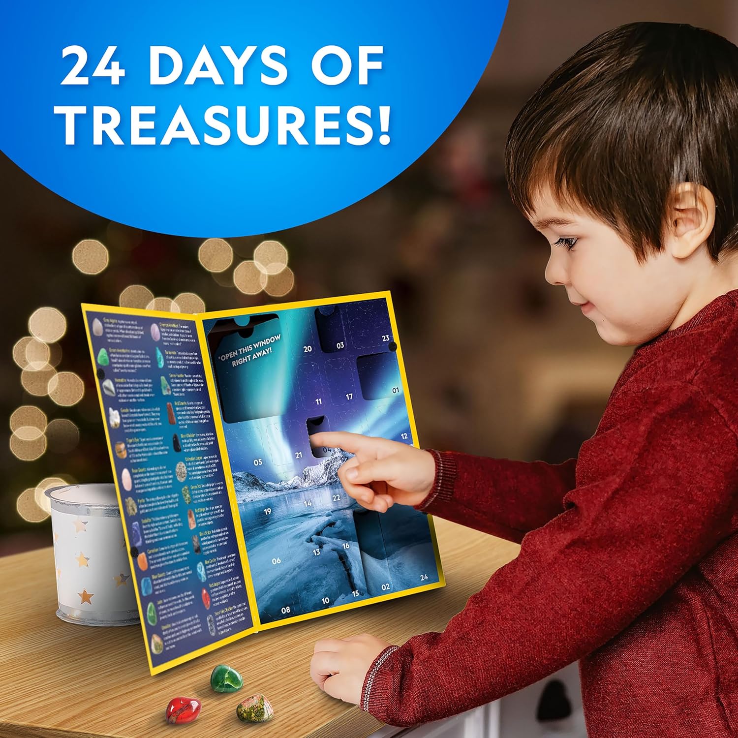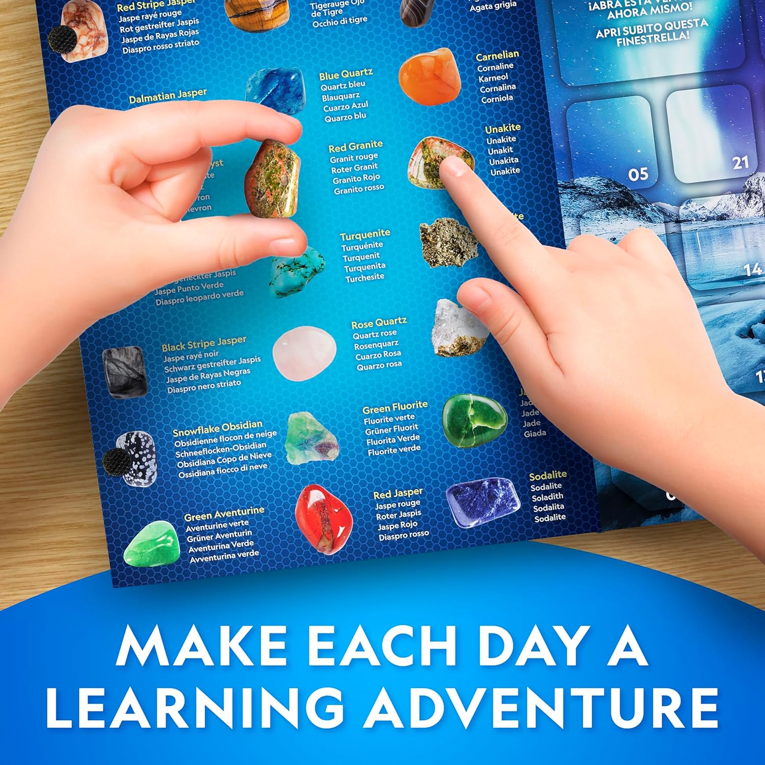 COLLECT 24 STUNNING SPECIMENS – The beautiful, polished gemstones for kids in this multi-lingual advent calendar include agate, green aventurine, hematite, sodalite, turquenite, tiger's eye, blue calcite and more!