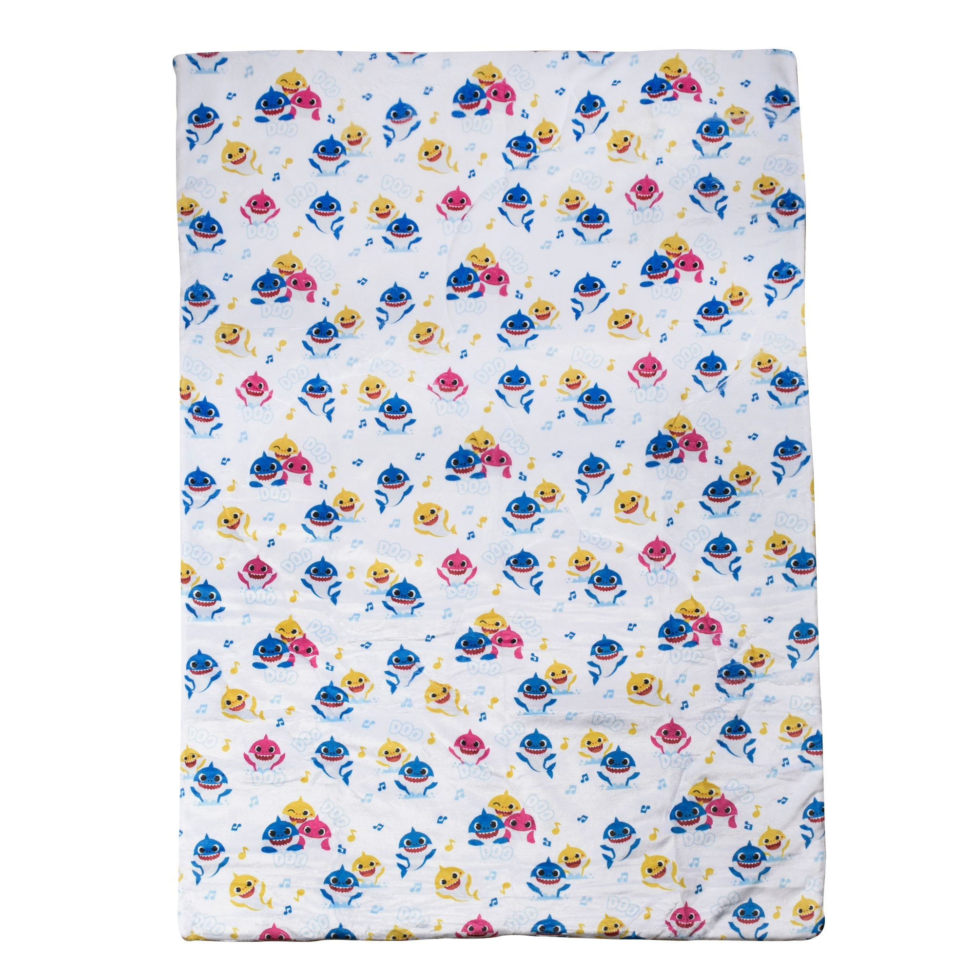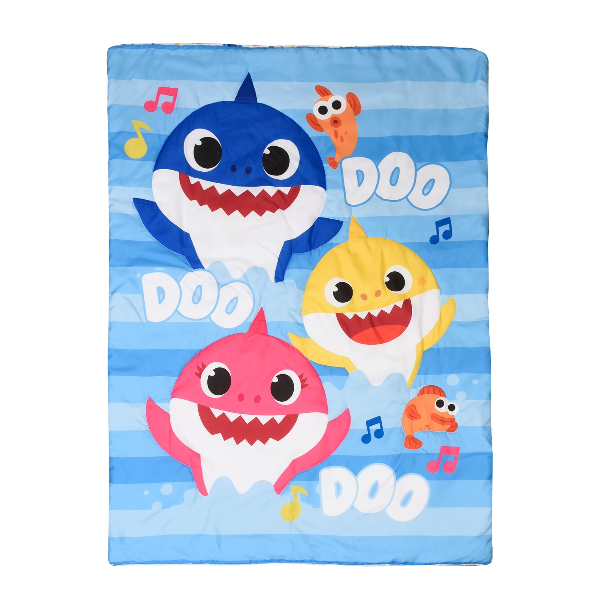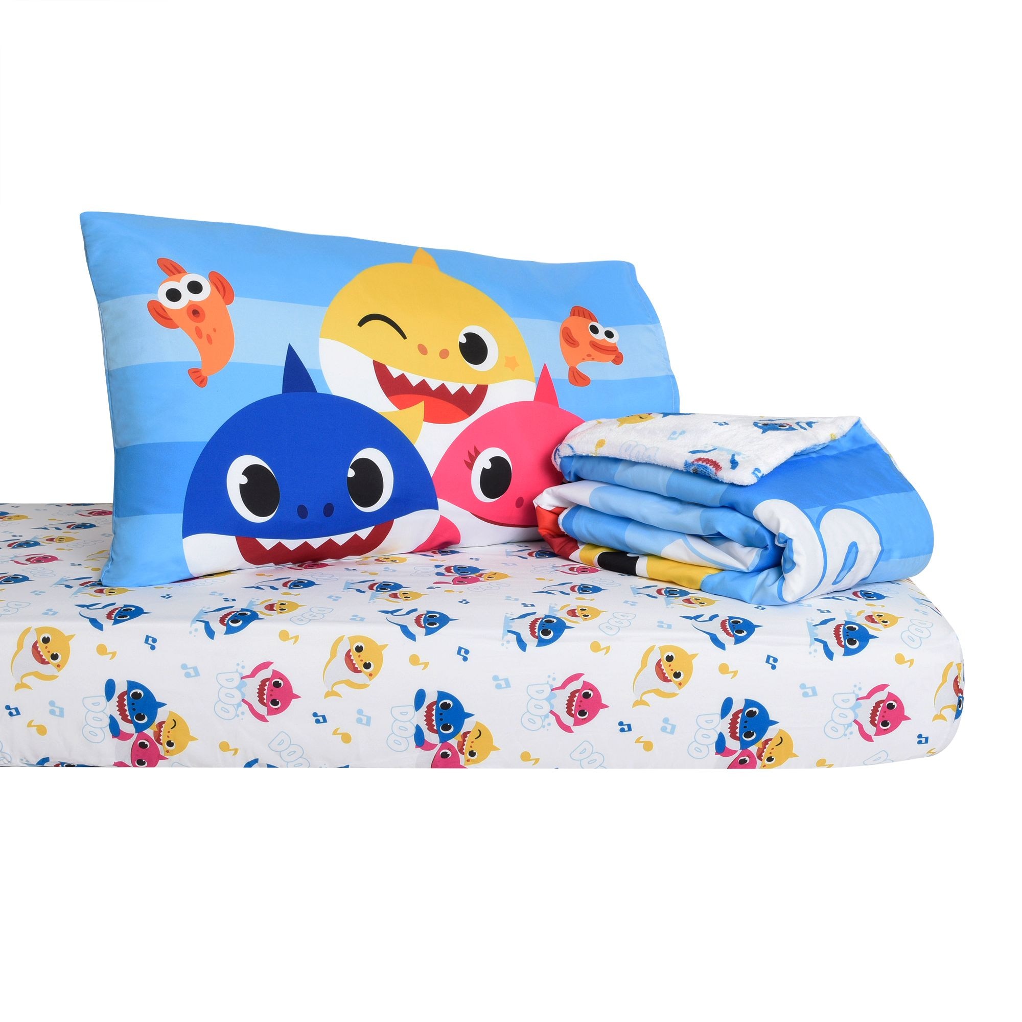 The Nemcor 3-Piece Baby Shark Toddler Reversible Comforter Set brings the deep sea straight to your little one’s bedroom. This 3-piece reversible set includes a comforter, fitted sheet, and pillowcase featuring everyone’s favourite shark family singing their signature “do doo do doo do doo” song. The vibrant graphics help toddlers learn about the family hierarchy of sharks while the soft 100% polyester provides cozy comfort. This Nemcor comforter set is designed to fit standard crib mattresses and pillows. Machine wash cold and tumble dry low to keep the pieces clean. Give your toddler sweet dreams of Baby Shark and friends with this lively comforter set.