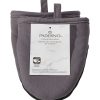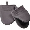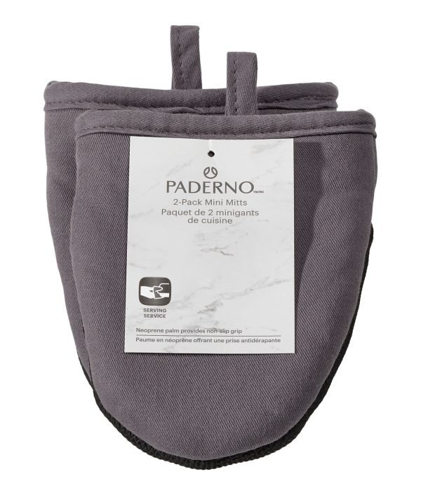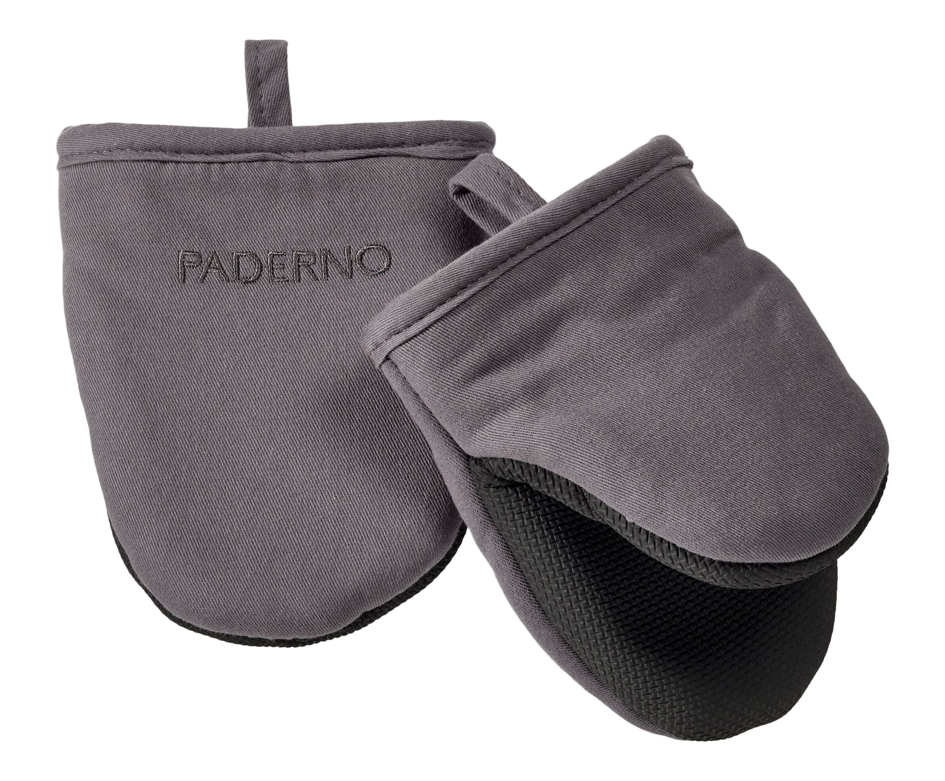 The PADERNO Neoprene Palm Mini Mitts, 2-Pack, are constructed from a neoprene material to ensure heat protection with a non-slip design to enhance safety, making them perfect for use while handling or serving hot dinnerware.