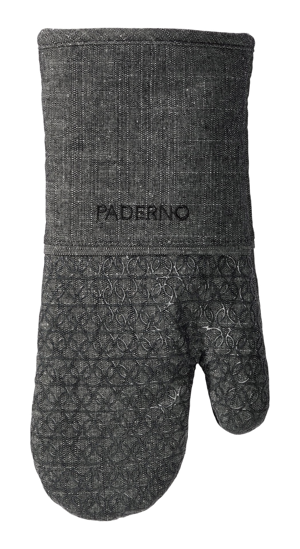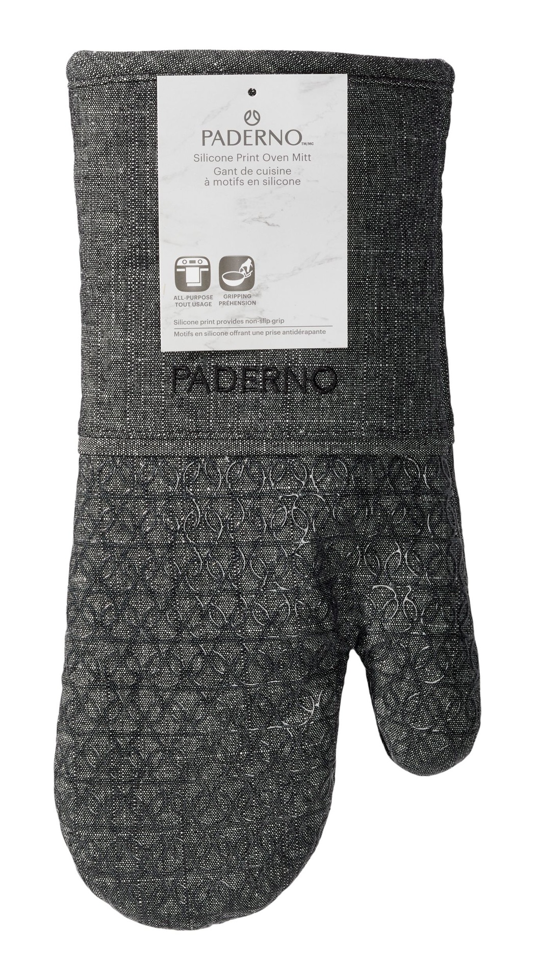 The PADERNO Printed Silicone Oven Mitt is ready to handle the heat. Made from silicone with a non-slip grip, it provides optimum heat protection so you can grab hot cookware and oven racks with confidence. The convenient hanging loop means easy storage, and the black chambray print adds style to your kitchen.