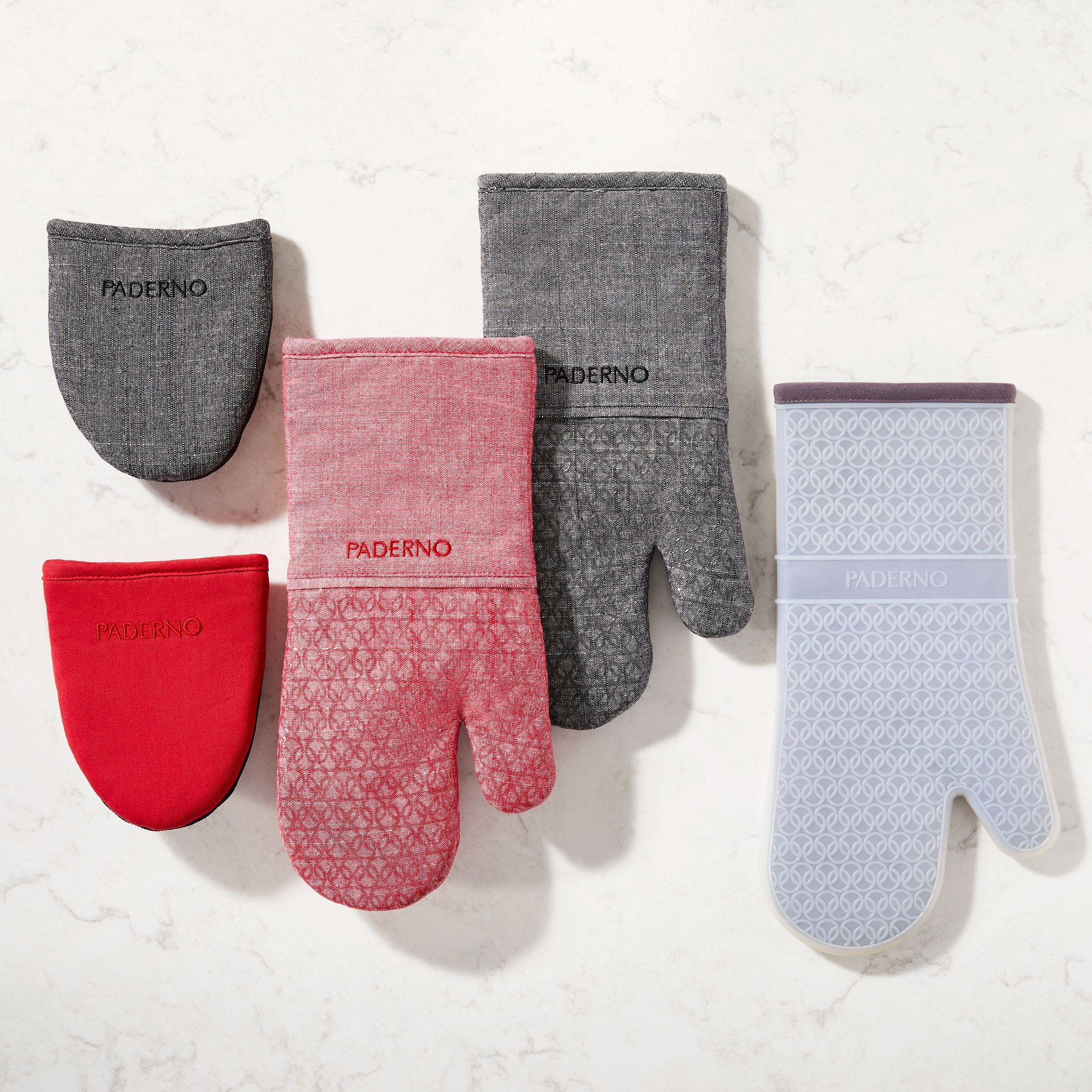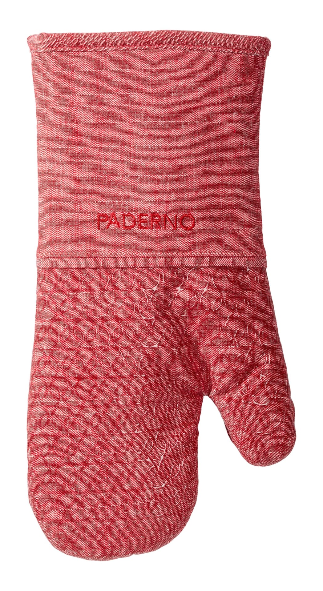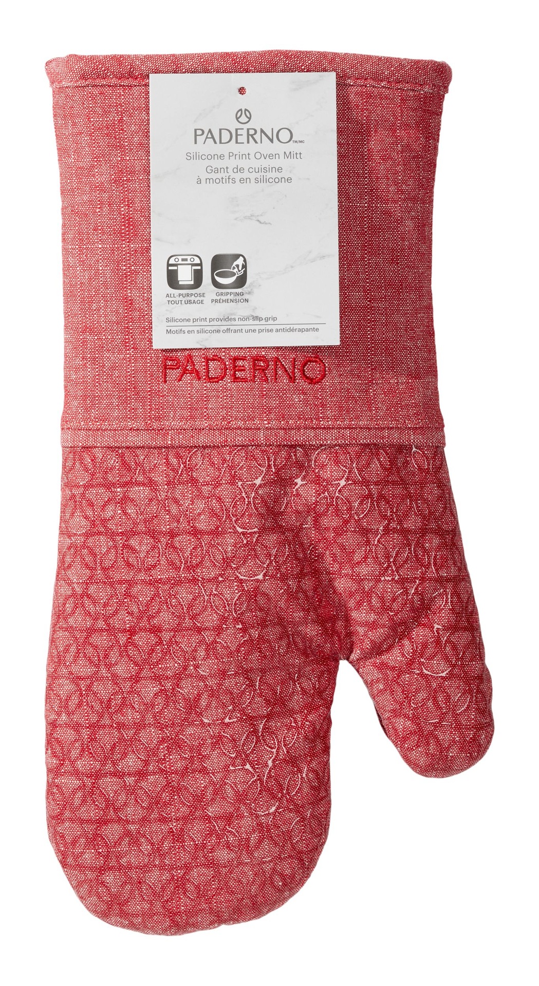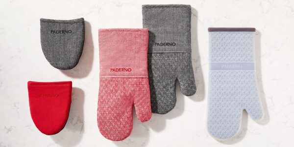 PADERNO Printed Silicone Oven Mitts protect your hands in a playful, chambray style. Made from heat-resistant silicone that can handle temperatures up to 500 degrees Fahrenheit, these red mitts shields your hand from hot pans, baking sheets, and oven racks with a non-slip grip for added safety. The silicone material ensures optimum heat protection while the convenient hanging loop makes storage a breeze.