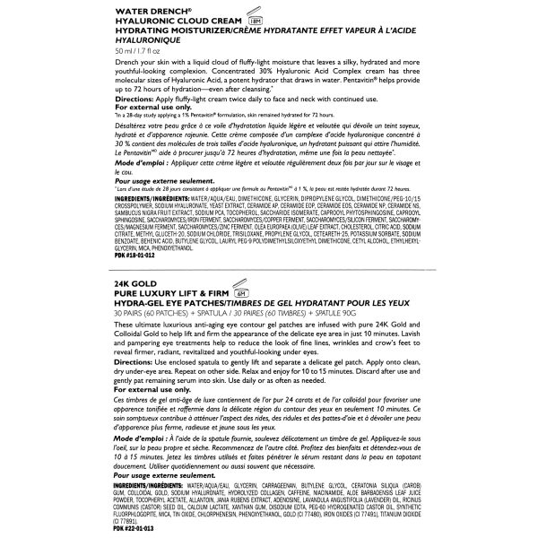 Ingredients 24K GOLD: Water/aqua/eau, glycerin, carrageenan, butylene glycol, ceratonia siliqua (carob) gum, colloidal gold, sodium hyaluronate, hydrolyzed collagen, caffeine, niacinamide, aloe barbadensis leaf juice powder, tocopheryl acetate, allantoin, jania rubens extract, adenosine, lavandula angustifolia (lavender) oil, ricinus communis (castor) seed oil, calcium lactate, xanthan gum, disodium edta, peg-60 hydrogenated castor oil, synthetic fluorphlogopite, mica, tin oxide, chlorphenesin, phenoxyethanol, gold (ci 77480), iron oxides (ci 77491), titanium dioxide (ci 77891)