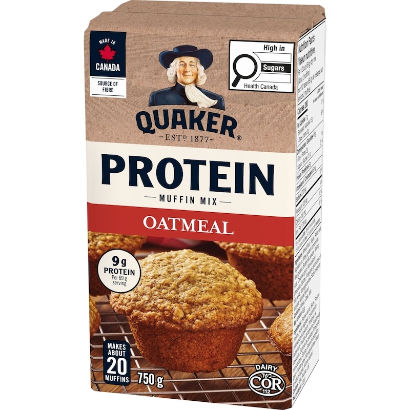 - Quaker Protein Oatmeal muffin mix makes it easy to tame those hunger pangs any time of day. This no-fuss mix makes about 20 protein oatmeal muffins; each 69 g serving offers 9 g of protein and a source of fibre. This mix is made in Canada and contains no artificial flavours or colours. There’s nothing better than a freshly baked muffin that’s still warm from the oven. With a little help from a Quaker muffin mix, anybody can whip up a beautiful batch at home that’s bursting with comforting, mouth-watering flavour.
