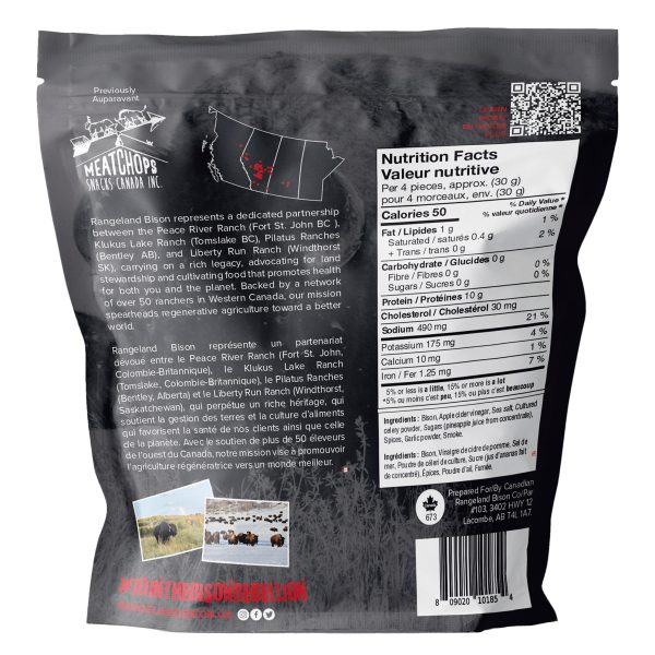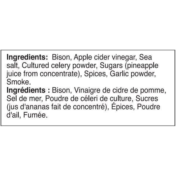 The ultimate low-fat snack! Rangeland bison jerky is the perfect snack to help you get through the day. This tender and lean meat provides an excellent source of protein. Crafted with pineapple juice and apple cider vinegar instead of refined sugars, this gourmet jerky is delicious, nutritious and free of hormones, steroids and antibiotics.