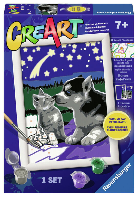 Make playtime as heartwarming as this adorable kitten and puppy with our glow-in-the-dark “Moonlight Friends” CreArt Painting by Numbers set!