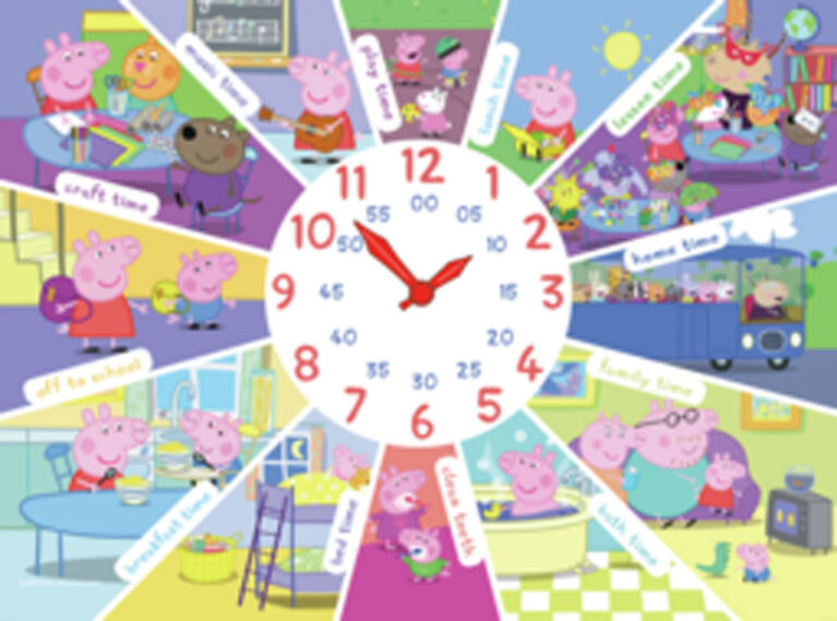 This colourful puzzle captures all the fun of a day in the life of Peppa Pig. It’s breakfast at 8, off to school at 9 and lunch time at 1 – Peppa has a busy schedule! Assembling the puzzle, chatting about the pictures and turning the movable plastic clock hands on the clock face to different times is a great way to introduce children to the concept of time. They can compare their day to Peppa’s – what time do they go to school, eat their lunch, have a bath or go to bed? They can see that Peppa’s day is very similar to their own, as she enjoys spending a busy day with friends and family. With rotating clock hands this is an ideal way to teach your child how to tell the time. Our 60 piece Clock puzzles are crafted with premium quality and measure 49x x34cm when complete. Great puzzles for Children 4 years old and up.