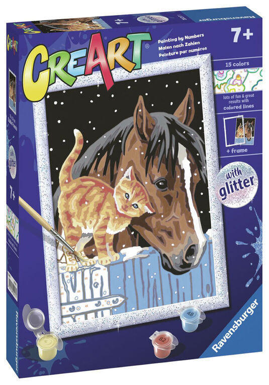 Treat your child to some soothing time with a cute kitten and sweet foal in this adorable “Stable Friends” CreArt Painting by Numbers set!