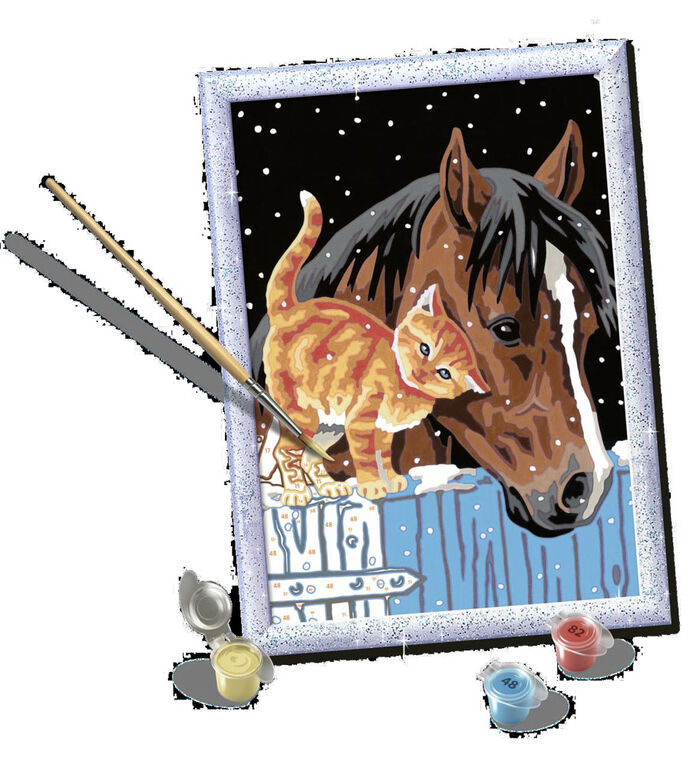 About this image:Treat your child to some soothing time with a cute kitten and sweet foal in this adorable “Stable Friends” CreArt Painting by Numbers set!