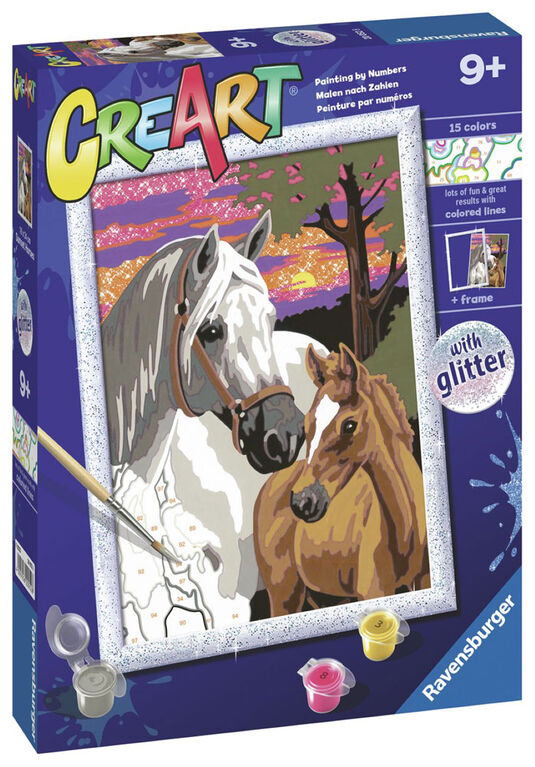 About this image: Bring a spark of joy to your child as they create this beautiful mare and her foal with our glittering “Sunset Horses” CreArt Painting by Numbers set!