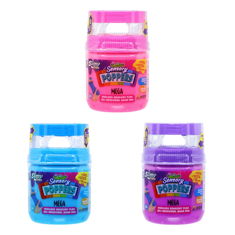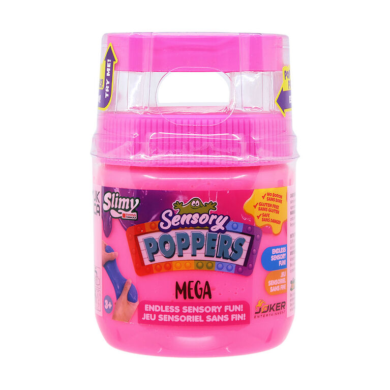 NEW SLIMY SENSORY POPPERS WITH MEGA COMPOUND FOR EXTRA POPPING FUN! NEVER-ENDING HAPTIC & ACOUSTIC PLAY! POP IT, FLIP IT AND REPEAT! COMBINING SLIMY & THE BUBBLE POPPER TREND.
