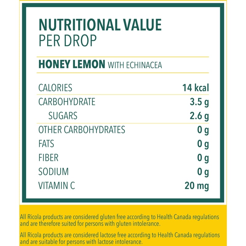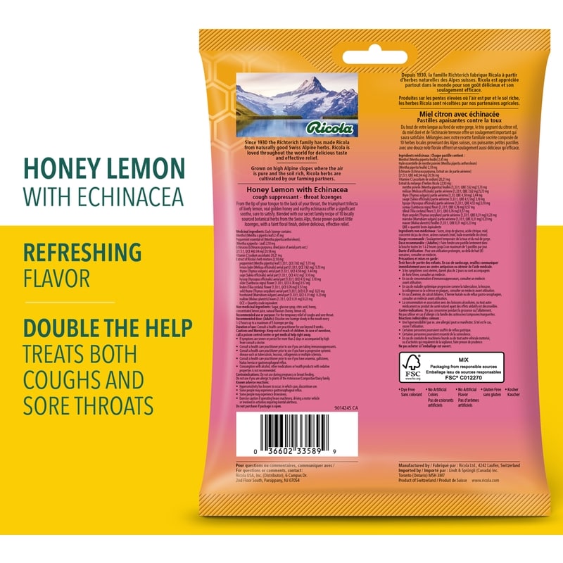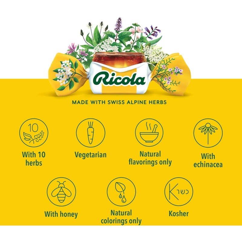 Ricola Honey Lemon with Echinacea cough drops help soothe your cough and sore throat. The please taste of these Ricola cough drops comes from real golden honey with refreshing herbal lemon balm and Echinacea from the Swiss Mountains. For nearly a century, Ricola has been helping throats around the world feel better. World-famous Ricola cough drops are made with 10 high-quality herbs grown high in the Swiss mountains, each with uniquely distinct traits. Ricola helps support you with soothing cough relief and sore throat relief.