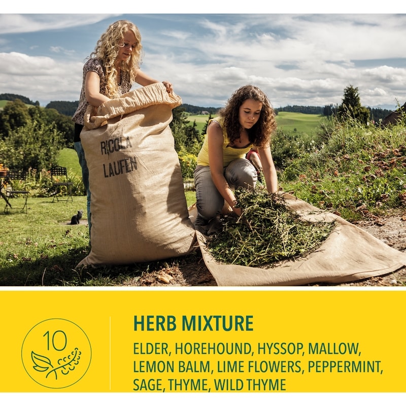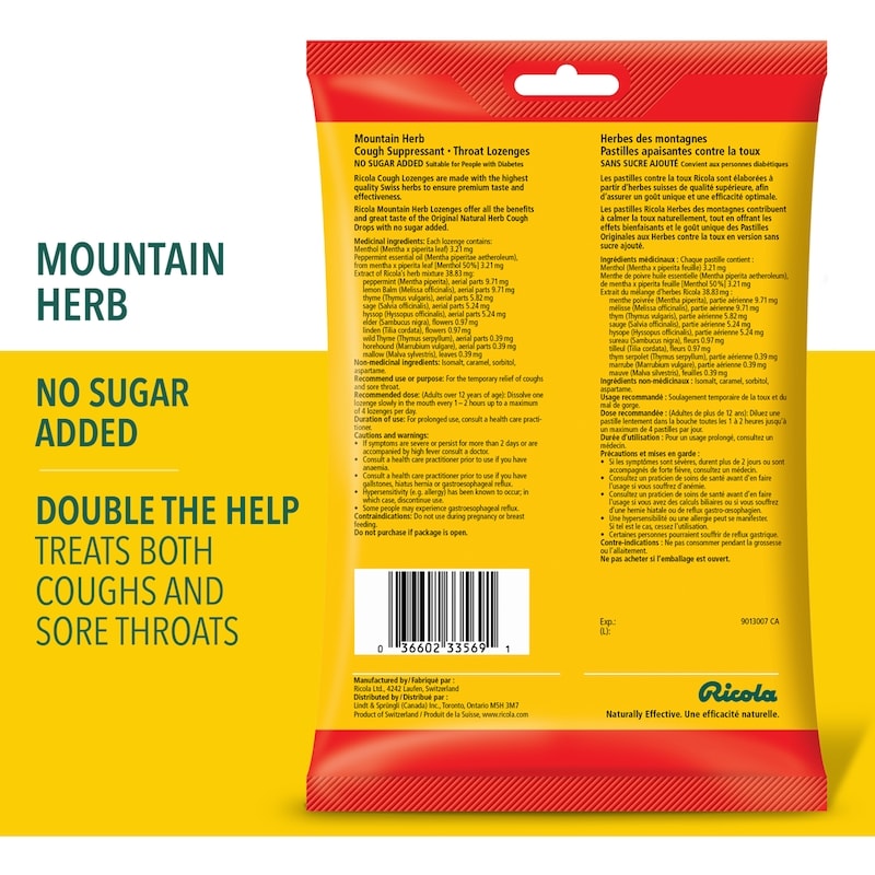 Medicinal ingredients per lozenge: Menthol (Mentha x piperita leaf) 3.21 mg, Peppermint oil (Mentha piperitae aetheroleum), from mentha x piperita leaf [Menthol 50%] 3.21 mg, Extract of Ricola’s herb mixture 38.83 mg: peppermint (Mentha piperita) aerial parts 9.71 mg, lemon balm (Melissa officinalis) aerial parts 9.71 mg, thyme (Thymus vulgaris) aerial parts 5.82 mg, sage (Salvia officinalis) aerial parts 5.24 mg, hyssop (Hyssopus officinalis) aerial parts 5.24 mg, elder (Sambucus nigra) flowers 0.97 mg, linden (Tilia cordata) flowers 0.97 mg, wild thyme (Thymus serpyllum) aerial parts 0.39 mg, horehound (Marrubium vulgare) aerial parts 0.39 mg, mallow (Malva silvestris) leaves 0.39 mg.Non-medicinal ingredients: Sucrose, glucose syrup, caramel.