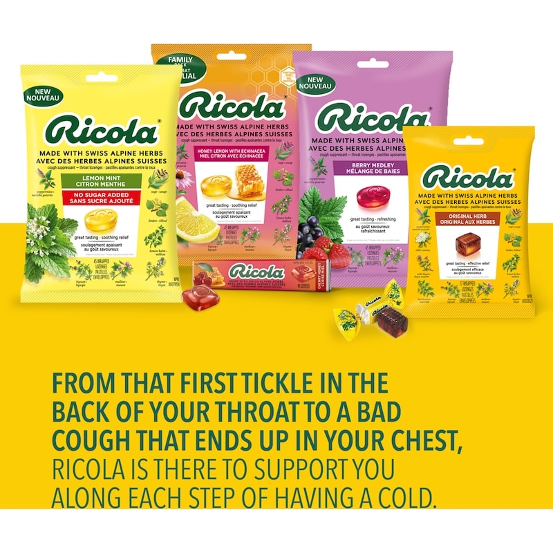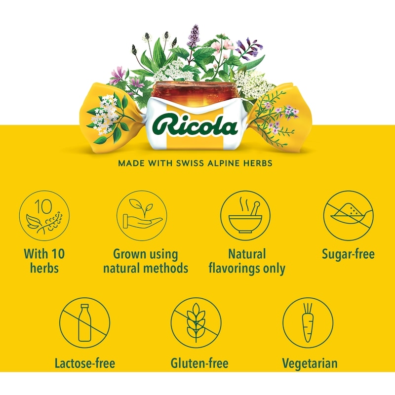Ricola Mountain Herb No Sugar Added cough drops are made with Ricola’s unique blend of Swiss mountain herbs to provide great tasting, soothing relief without sugar. For nearly a century, Ricola has been helping throats around the world feel better. World-famous Ricola cough drops are made with 10 high-quality herbs grown high in the Swiss mountains, each with uniquely distinct traits. Ricola helps support you with soothing cough relief and sore throat relief for itchy throats from allergies or with daily voice care for dry and hoarse throats.