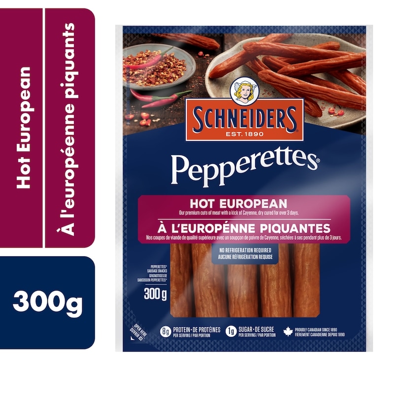 Enjoy rich, meaty flavour with a spicy kick in every bite of Schneiders® Pepperettes® Hot European Sausage Sticks. Crafted in the Landjäger method, these dry meat snacks are made from quality cuts of meat, fermented and dry cured and seasoned with a variety of spices and an extra hit of cayenne to give them a tangy, spicy taste. Requiring no refrigeration, Pepperettes® sausage meat sticks are a great addition to an appetizer platter or charcuterie board. Since 1890, Schneiders® brand has established a rich heritage of original and authentic recipes, using premium ingredients and taking all the time needed to honour the origin and inspiration of each recipe. Quality never gets old™.