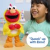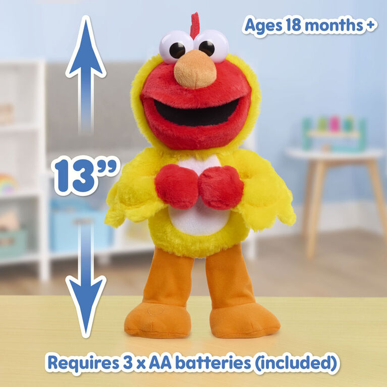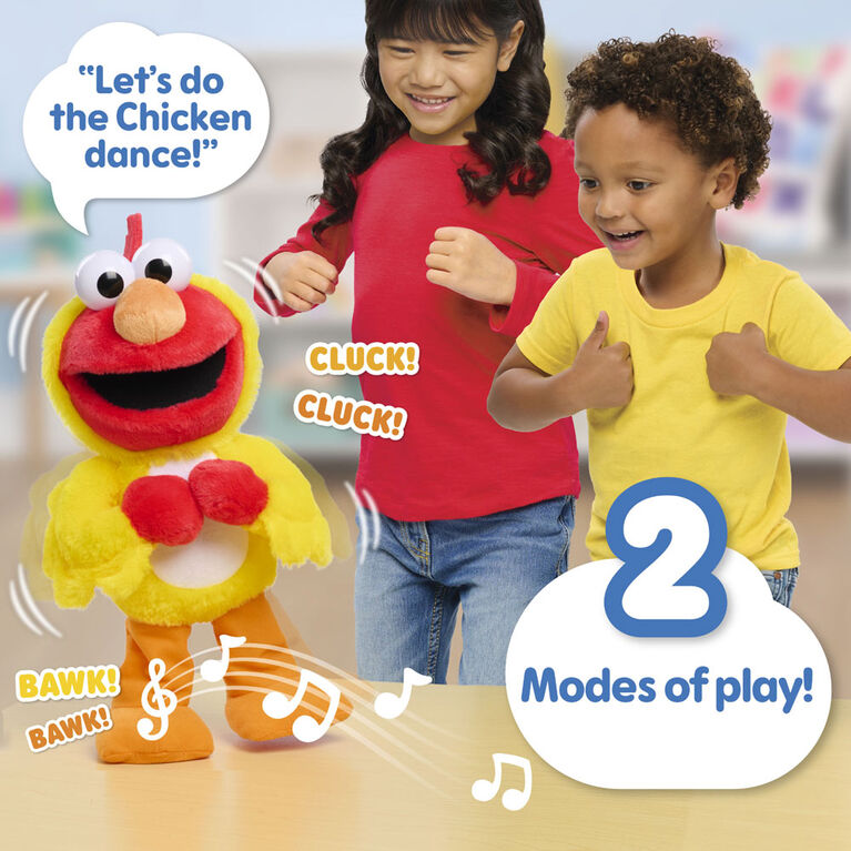 Kids tap into the power of giggles as they cluck and flap along with the Sesame Street Chicken Dance Elmo Animated Plush. Dance, chat, and sing along with the fun-loving Elmo. Press his foot to begin 2 modes of playtime fun. Elmo dances and chirps to an “egg-citing” version of the popular “Chicken Dance” song – “Elmo wants to be a chicken, Elmo wants to be a duck, cluck-cluck-cluck-cluck!” In the second mode, this Sesame Street monster “quacks” kids up with silly jokes and invitations to play along. Little ones will love cuddling and moving to the music played by this interactive stuffed animal. Covered in irresistibly soft materials and recycled fill, this snuggly, 13-inch-tall Elmo plushie is perfect for anytime snuggles and a whole lot of chicken dancing fun. Surprise kids 18 months and up with this classic Sesame Street toy. Requires 3 x AA batteries (included). Sesame Street and associated characters, trademarks, and design elements are owned and licensed by Sesame Workshop.
