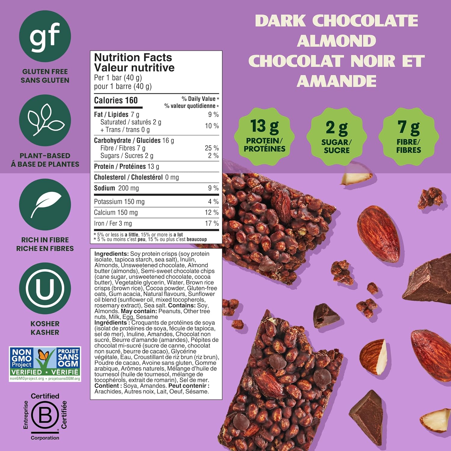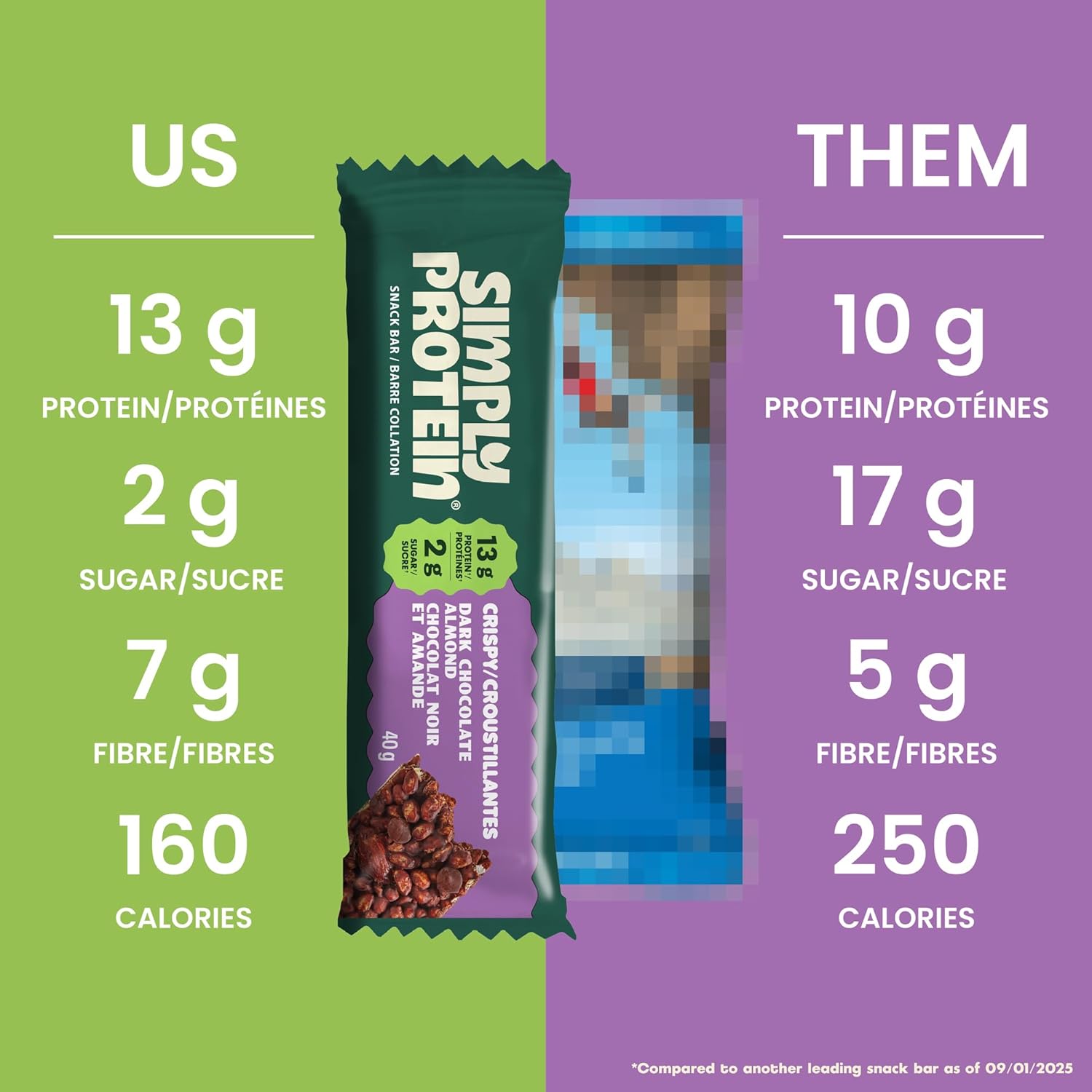 Simply Protein – Dark Chocolate Almond Crispy Bars – Plant Based Protein Bars – Low Carb, Low Sugar, High Fibre – 13g Protein, 2g Sugar, 7g Fibre – Vegan, Gluten Free, Non GMO, Kosher – 12 Bars