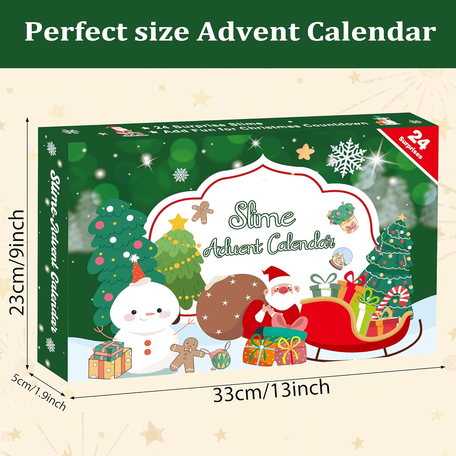 - Creative and Funny Slime Kit: The Christmas Countdown Advent Calendars measures 34.2*20.2*4.8 and has a tiny "window" from December 1st to Christmas Eve, revealing a new surprise each day