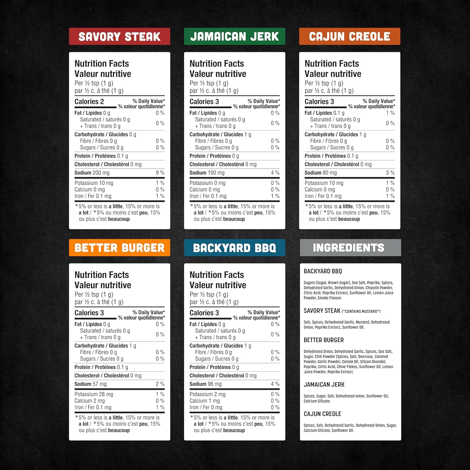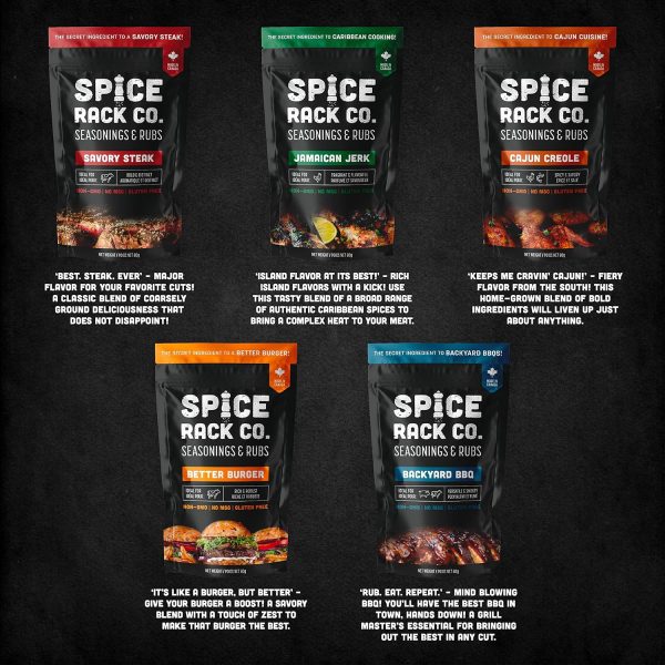 - Major flavor for your favorites – this BBQ spices and rubs gift set contains 5 unbelievable blends: Savoury Steak seasoning, Better Burger seasoning, Backyard BBQ rub, Cajun Creole seasoning, and Jamaican Jerk seasoning.