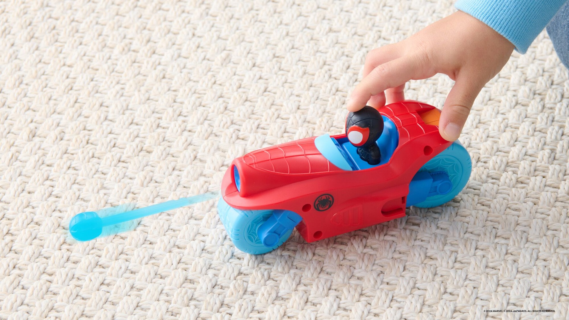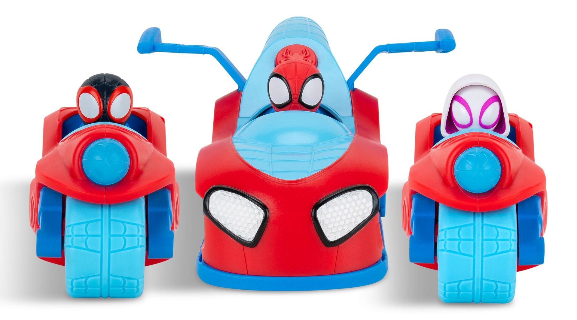 Get ready for action with the Spiderman Spidey & His Amazing Friends Split Racer. Start by merging the entire team into one racer for an exhilarating ride. When it’s time to split, simply press the Spidey icon on the back to separate the vehicles. Use the heads to launch Web Darts at villains in your path and press the trigger on Spidey’s jet to pop out the wings and activate exciting sounds. When the mission calls for regrouping, easily attach both motorcycles to the jet and race together again. Inspired by the hit show Spidey and His Amazing Friends.