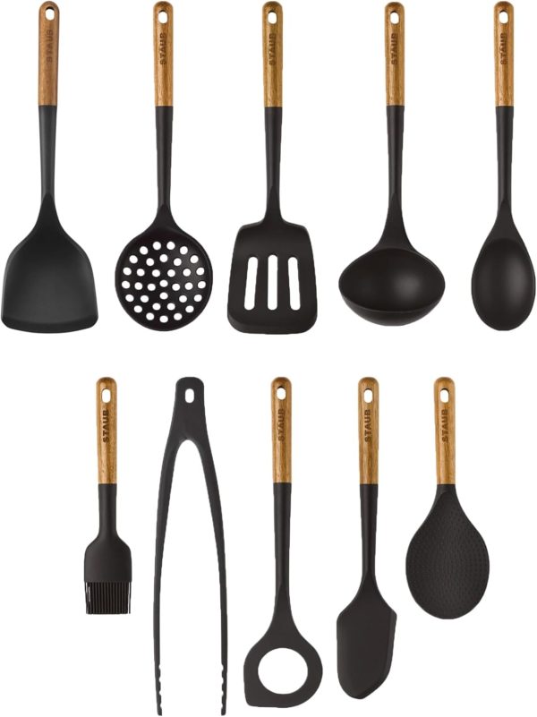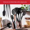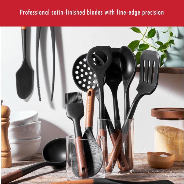 - Set contains: Soup Ladle, Serving Turner, Serving Spoon, Skimming Ladle, Tongs, Wok Turner, Pastry Scrapper, Risotto spoon, Rice Spoon, and Pastry Brush