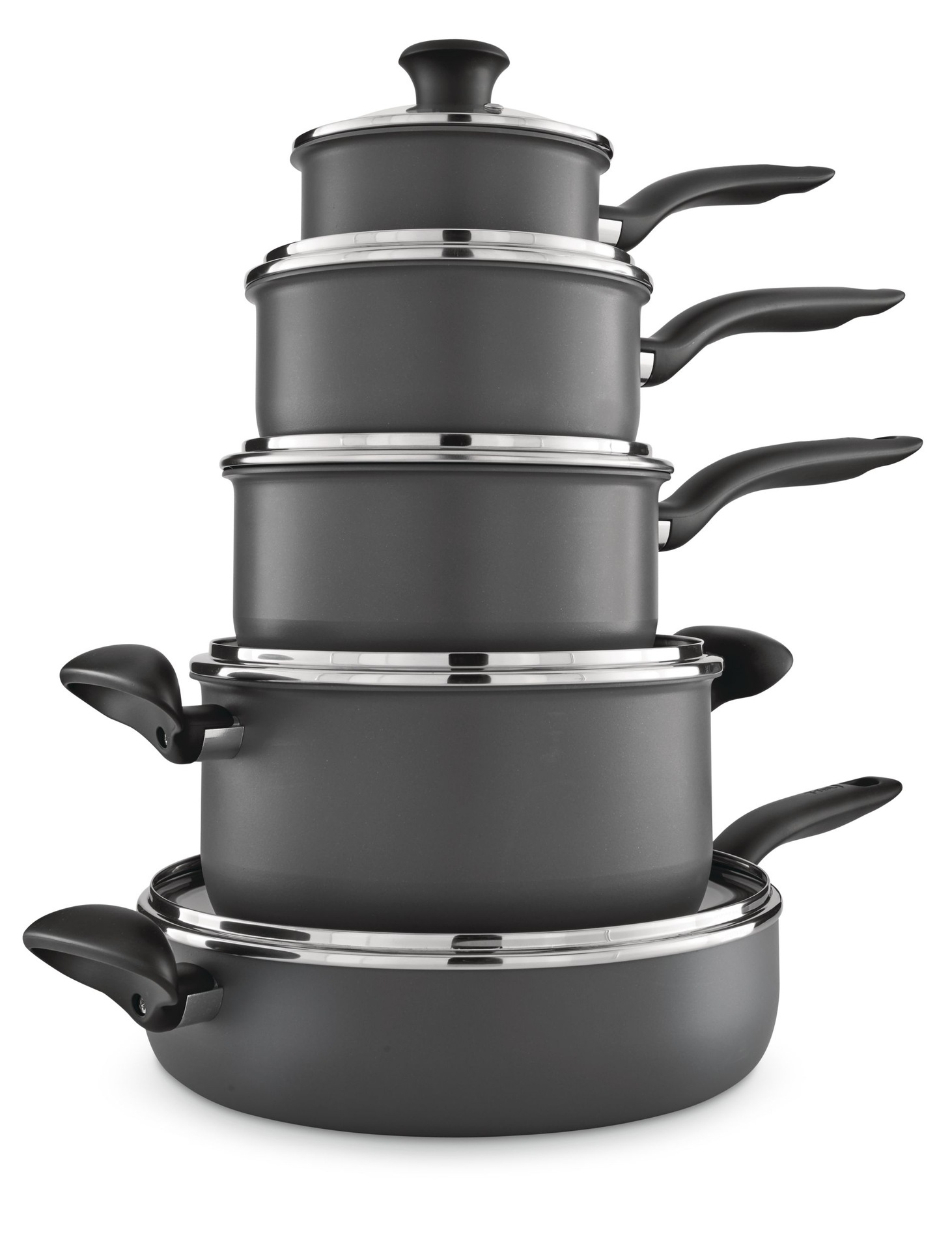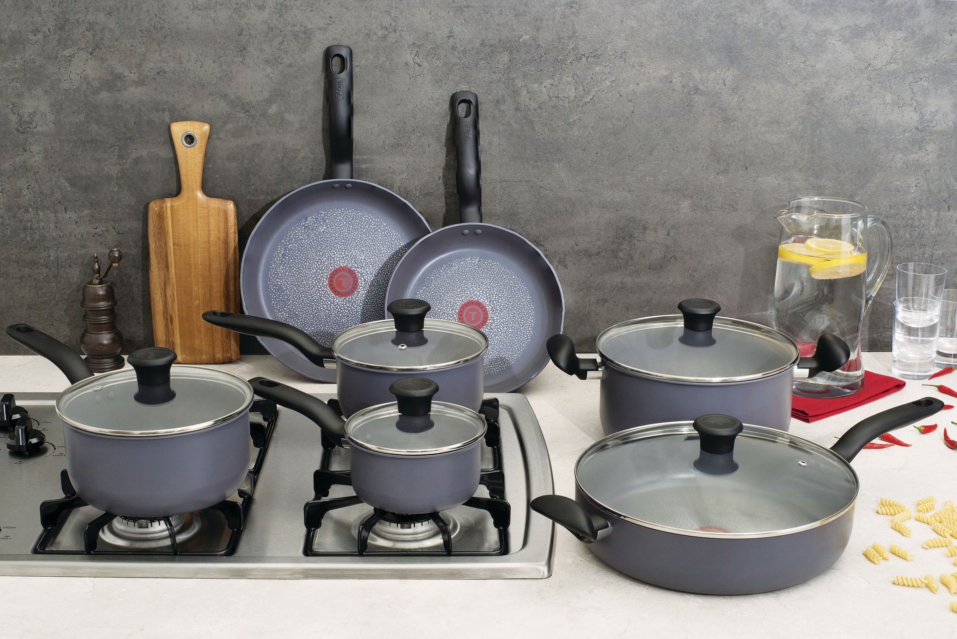 Attractive and hardworking, the T-fal Hard Titanium Cookware Set is a great addition to your kitchen. The Titanium Pro non-stick coating lasts four times longer than traditional non-stick coatings, stands up to daily use, and cleans up in a snap. The set features T-fal’s unique Thermo-Spot® technology that indicates ideal cooking temperature for better results. The cookware set includes all the essential products and sizes to meet your daily cooking needs.