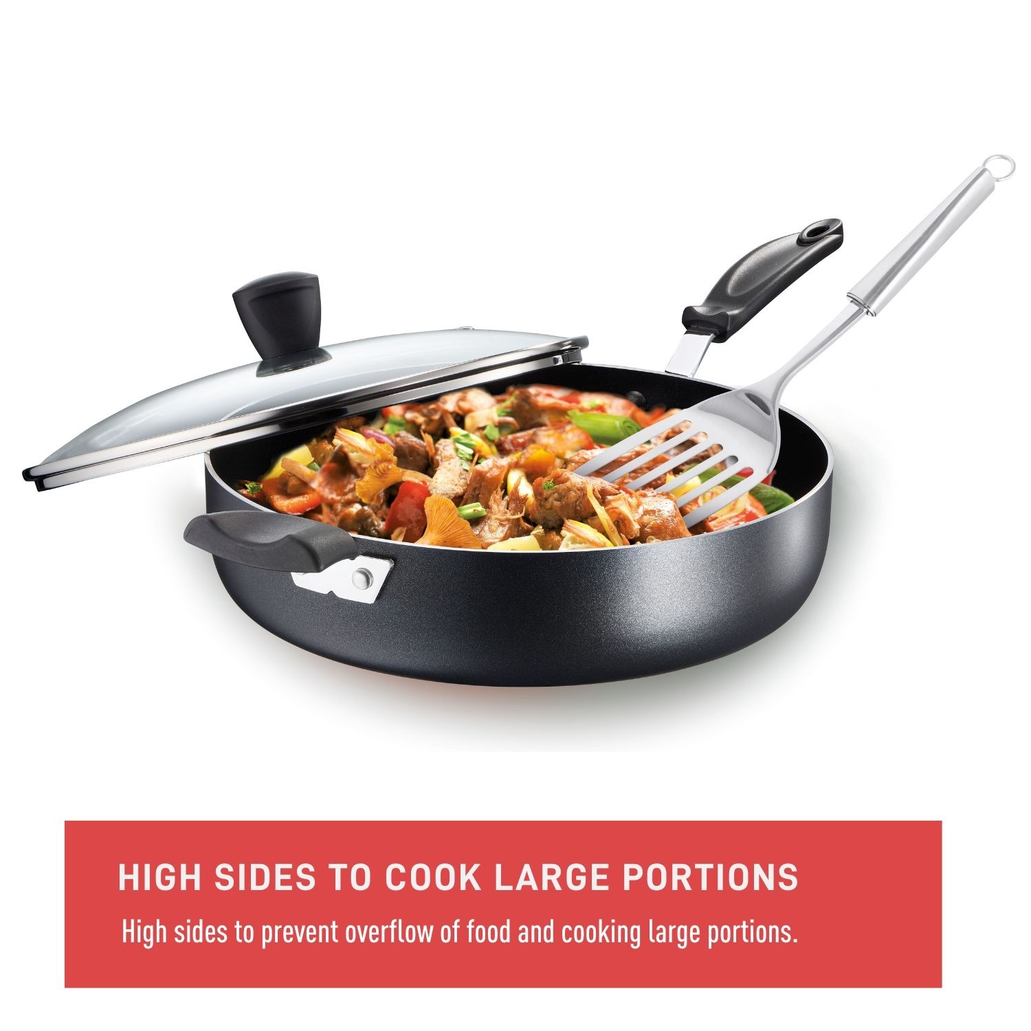 You can cook all your favourite dishes in the T-Fal Viva Jumbo Cooker, with enough capacity to feed the whole family. This large cooker can accommodate a wide range of dishes, and the high sides make it ideal for stews or your favourite casserole. The riveted, ergonomic Bakelite handles ensure a steady and comfortable grip while protecting hands from heat. This jumbo non-stick cooker is not suitable for use on induction cooktops.