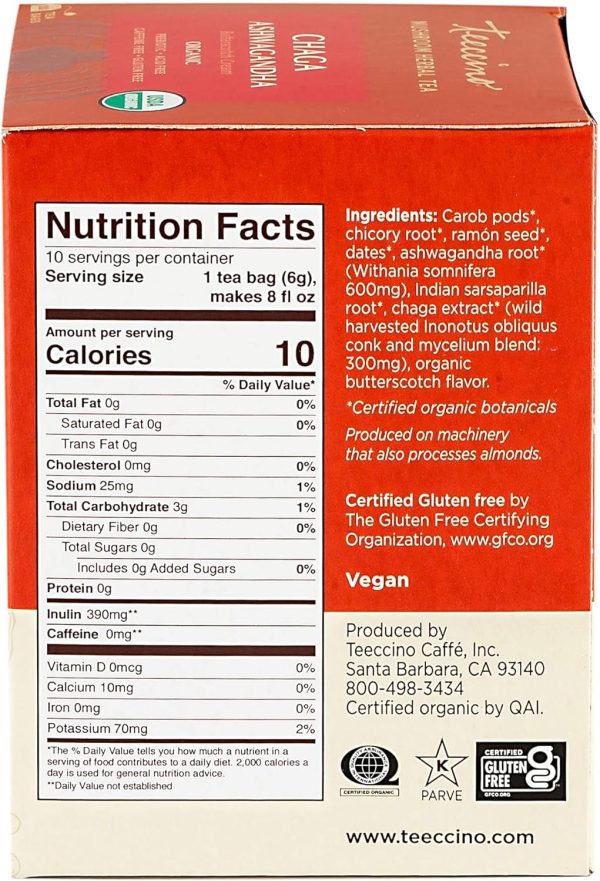 Teeccino Mushroom Adaptogen Tea – Chaga Ashwagandha French Roast Herbal Tea with Wild-Harvested Chaga Mushrooms & Ayurvedic Ashwagandha Root for Immune Support, 10 Tea Bags