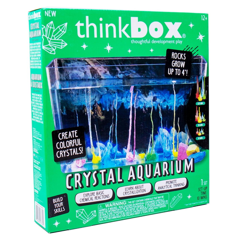Explore simple reactions that result in gorgeous crystal formations with the Thinkbox Crystal Aquarium! Decorate and personalize the see-through aquarium with a fun graphic background and decals, then combine the crystal growing solution and crystal growing seeds. Watch as the crystals grow before your very eyes! Learn the science behind crystal formations as you observe this hands-on activity. Recommended for scientists 12 and up.