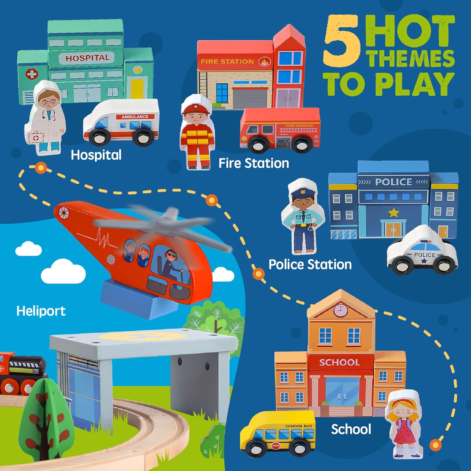 - Use Blocks To Create Your Own Town: Hot themes to play: hospital, fire station, police station, school and heliport. Rich scenario building blocks and matching character accessories are conducive to stimulate creativity and imagination! We believe that our wooden train set can promote logical thinking, problem solving, creative thinking, hand-eye coordination and fine motor skill development of your little one.