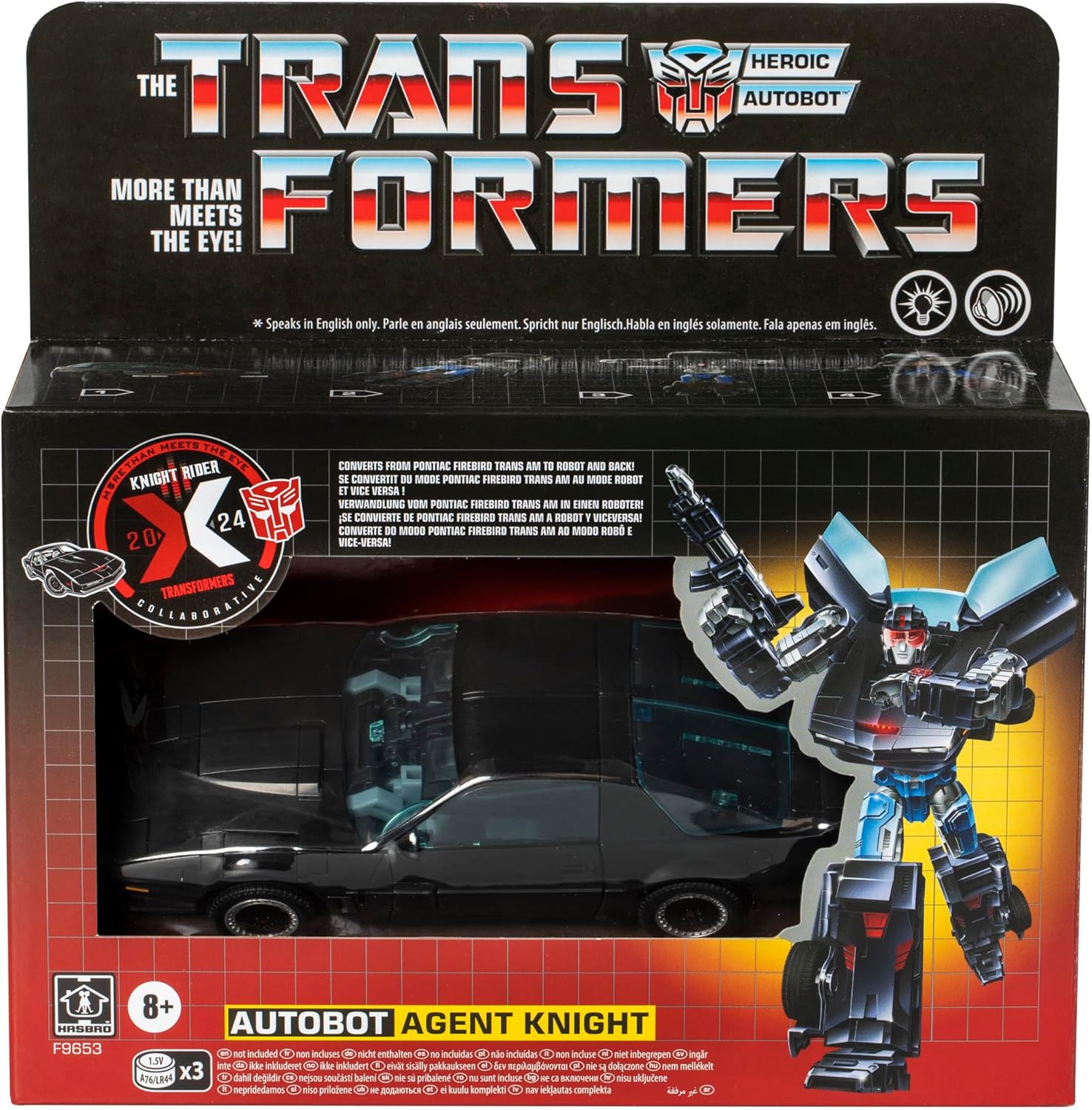 The worlds of Transformers robots and Knight Rider collide with the Transformers x Knight Rider Autobot Agent Knight mash-up pack! The iconic KITT car from the Knight Rider series is now a Transformers robot! This 6.5-inch (16.5 cm) Autobot Agent Knight action figure converts from robot mode to Pontiac Trans Am alt mode in 22 steps. It features series-accurate deco and details from the classic TV show. It has electronic sounds, phrases, and scanner effect lights in both modes. The Transformers toy includes 2 blasters accessories that attach in both modes and a comm link that attaches in robot mode. Transformers robots have always been — More Than Meets the Eye — but now, through the Transformers Collaborative, fans can experience these larger-than-life characters as they team-up, mash-up, and meet up with other characters, teams, and people who share this same special quality. Speaks in English only. Requires 3x A76/LR44 button cell batteries (not included). TRANSFORMERS and HASBRO and all related trademarks and logos are trademarks of Hasbro, Inc. Copyright Universal City Studios LLC. All Rights Reserved. Cadillac and all related Emblems and vehicle body designs are General Motors Trademarks used under license to Hasbro, Inc.