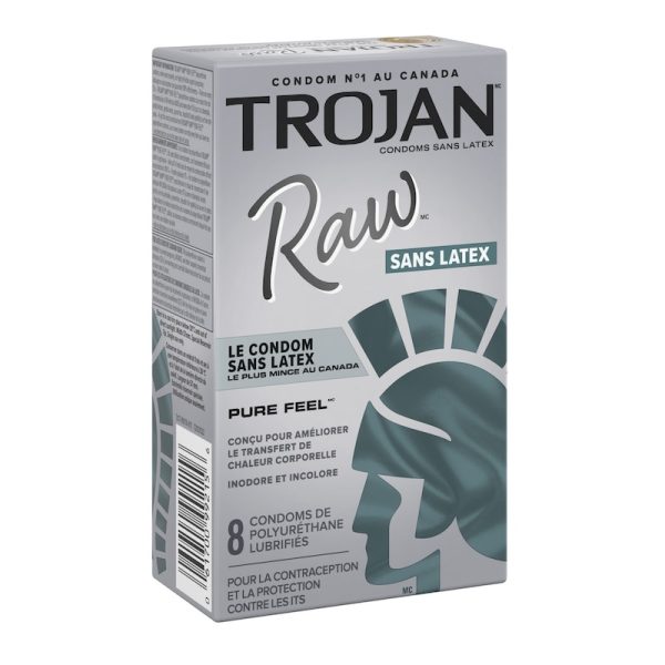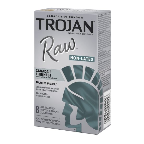 Trojan® Raw™ Non-Latex condoms are ultra-thin polyurethane condoms for ultimate sensual pleasure. Trojan® Raw™ Non-Latex condoms are Canada’s thinnest non-latex condom, made with Pure Feel™ Non-Latex that is odourless, colourless and designed to enhance body heat transfer. Trojan® Raw™ Non-Latex condoms include a silky smooth lubricant to increase comfort and sensitivity. Electronically tested to help ensure reliability. For extra safety, there is a special reservoir end. Tapered at the base for a secure fit. FOR LATEX SENSITIVE CONDOM USERS. Use these condoms if you or your partner are allergic to latex. Trojan®Raw™ Non-Latex brand condoms are intended to prevent pregnancy, HIV/AIDS, and other sexually transmitted infections. Trojan®Raw™ Non-Latex brand condoms reduce the risk of transmitting STIs by providing a barrier against the source of the infection. FEEL THE CLOSEST: Designed to enhance body heat transfer ODOURLESS and COLOURLESS, Latex-Free COMFORT & SENSATION: Features SILKY SMOOTH LUBRICANT PREMIUM QUALITY NON-LATEX: Made from non-latex medical grade polyurethane to help reduce the risk of pregnancy and STIs