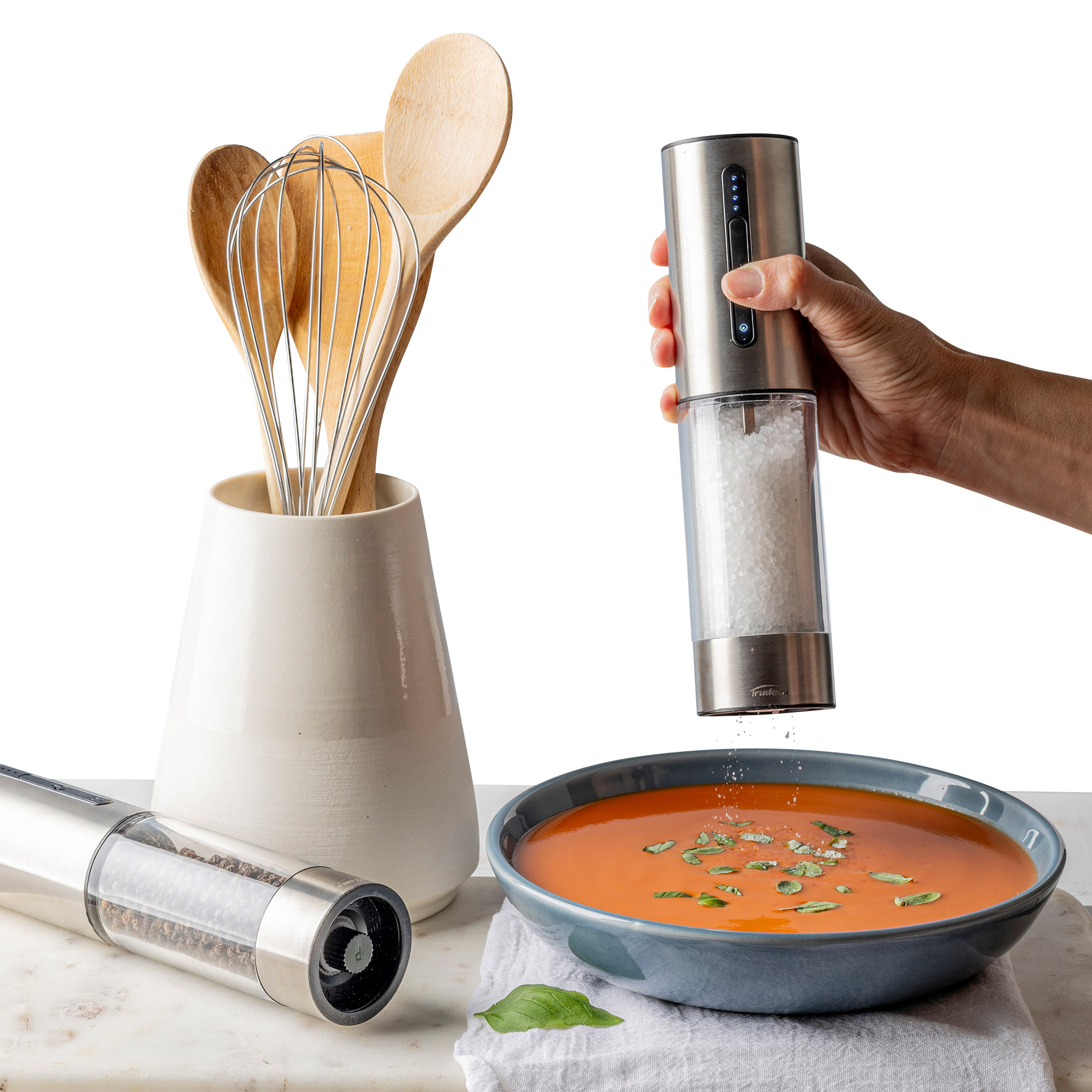 Season your dishes to perfection with Trudeau OneTouch electric salt and pepper imills. With the touch of a button, enjoy precise one-handed grinding thanks to high-precision and rust-proof ceramic grinders. The long-lasting lithium battery recharges quickly via USB, and LED indicators display the battery level. With high-capacity reservoirs and adjustable knobs for fine to coarse grinding, these mills are as smart as they are stylish.