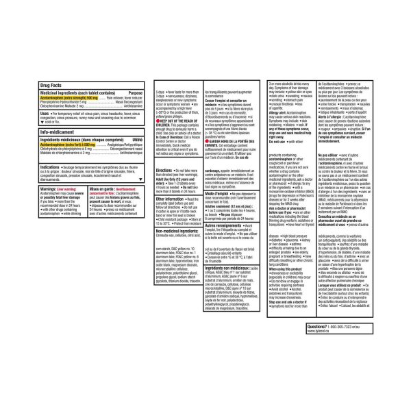 Tylenol Sinus Extra Strength Nighttime Tablets, 20 Count, help relieve your night sinus symptoms so you can rest. Get effective relief of symptoms including nasal congestion, sinus pain and pressure, sinus headache, sinus congestion, aches and pains, runny nose and sneezing so that you can get back to your normal, whatever your normal is. Each green tablet is made with 500 mg of Acetaminophen to help relieve pain and reduce fever, 5 mg of Phenylephrine Hydrochloride for nasal decongestion, and 2 mg of Chlorpheniramine Maleate antihistamine for runny nose and sneezing. Made in an easy-to-swallow eZ tablet form. To use, Adults and children 12 years and older, take 1-2 daytime tablets every 4 hours as needed. Do not exceed 8 tablets in 24 hours.
