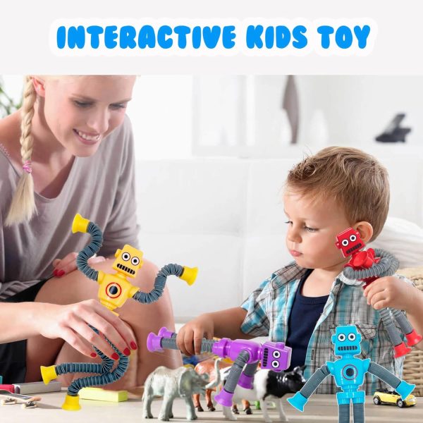 Upgrade Pop Tubes Robot Toy 4 Pcs Easter Basket Stuffers Sensory Toys for Autism Toddler Telescopic Suction Cup Robotics Fidget Toys School Party Favors for Kids Autistic ADHD Travel Toy
