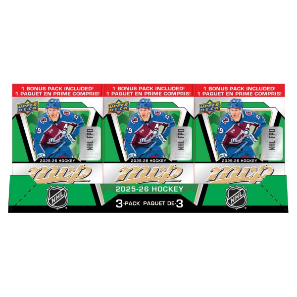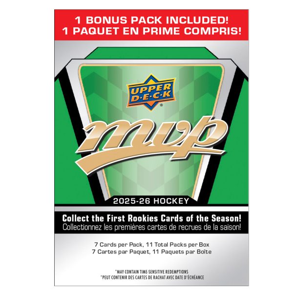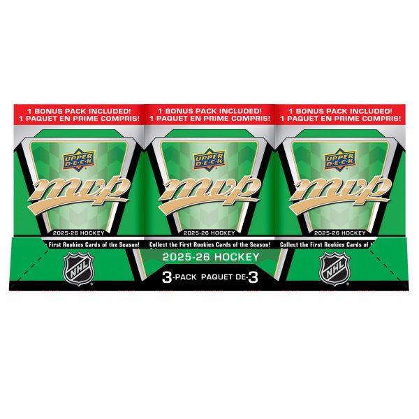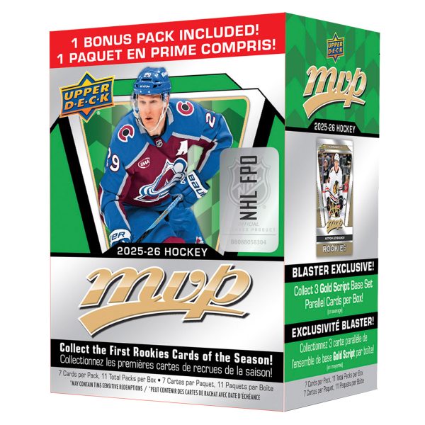 Your 2025-26 hockey card collection starts here! The latest edition of MVP Hockey features a 250-card Base Set – which includes 50 SP and Rookie cards, popular Base Set parallels, and a stellar lineup of new inserts sets. Additionally, each Blaster box contains a bonus pack containing three (3) exclusive Gold Script parallels of the Base Set!