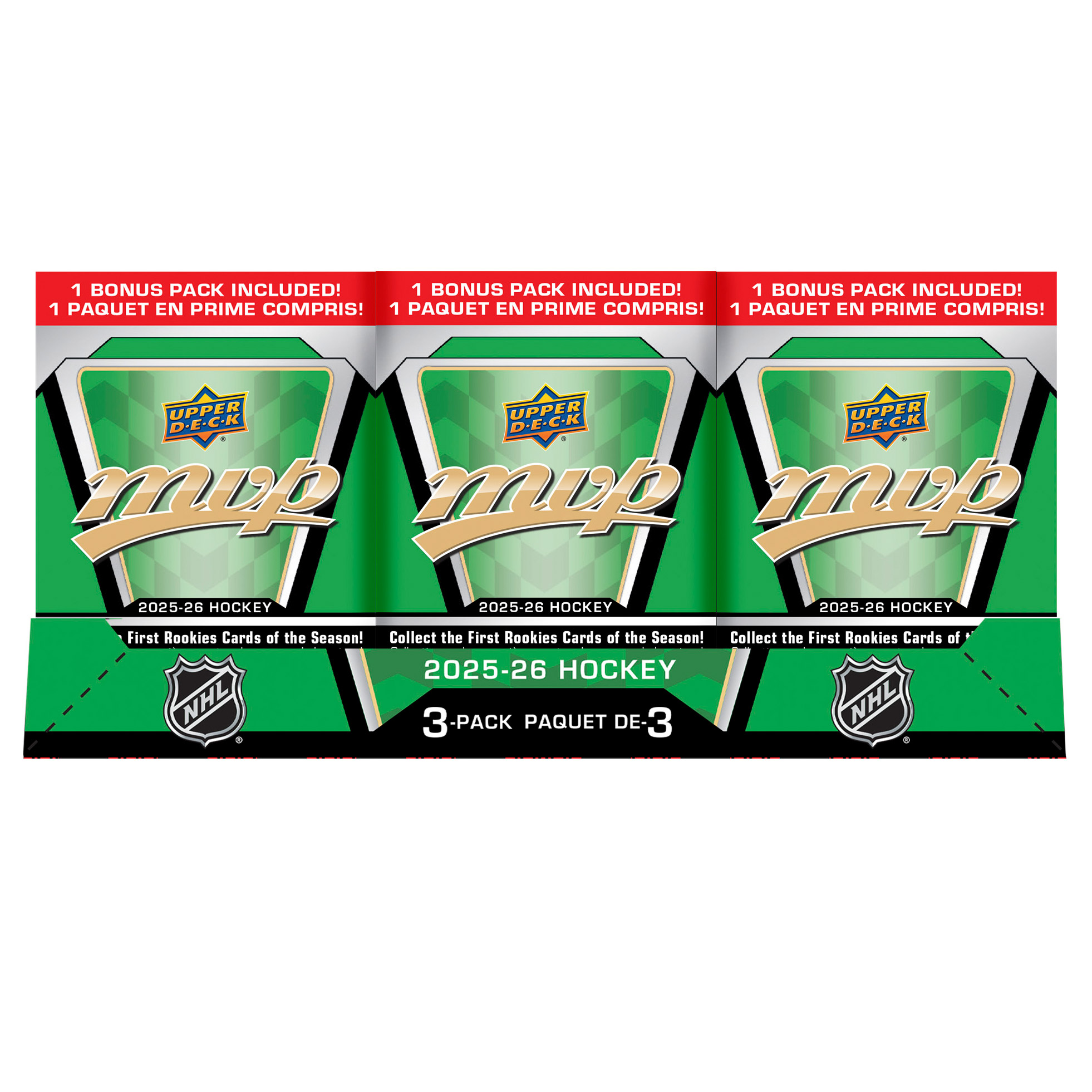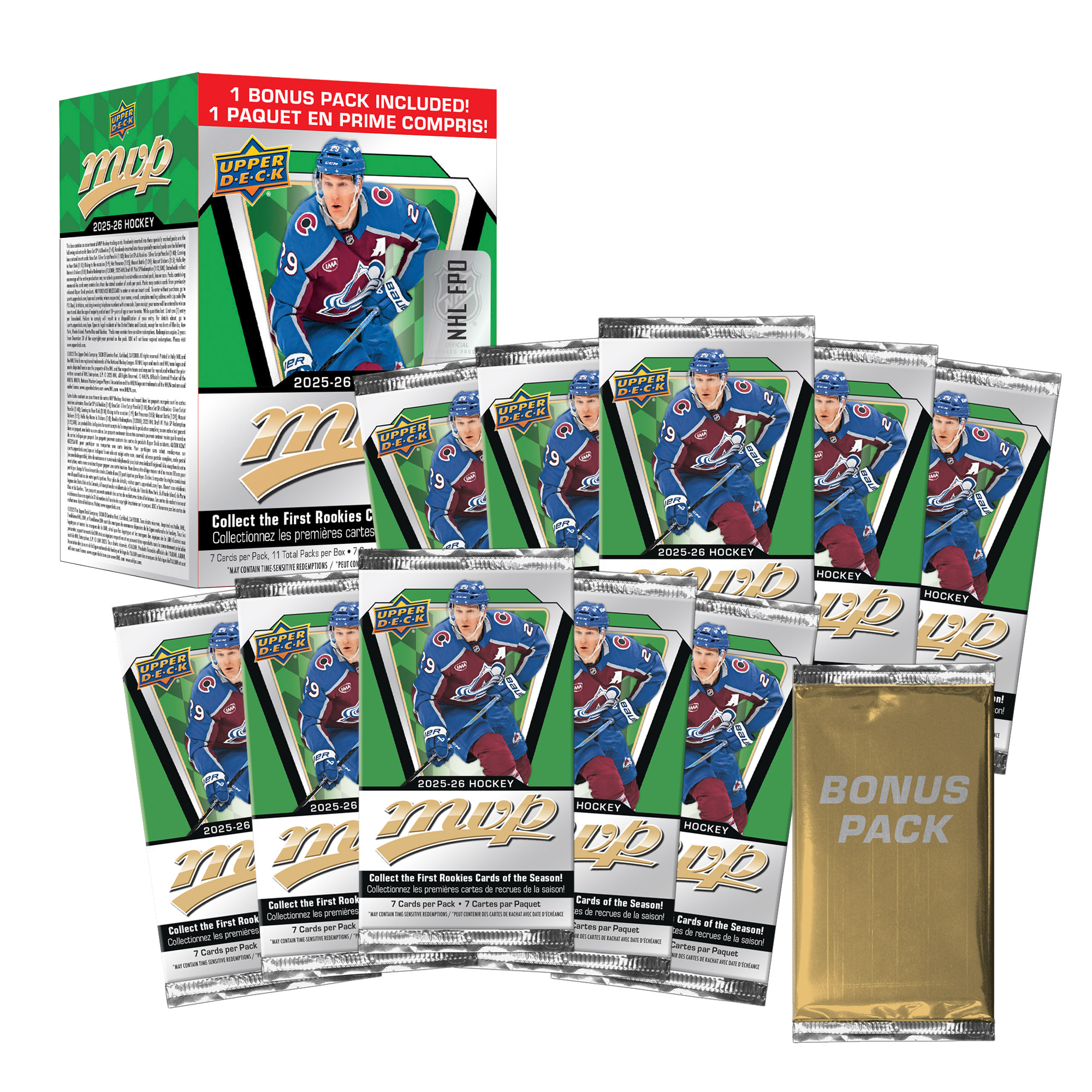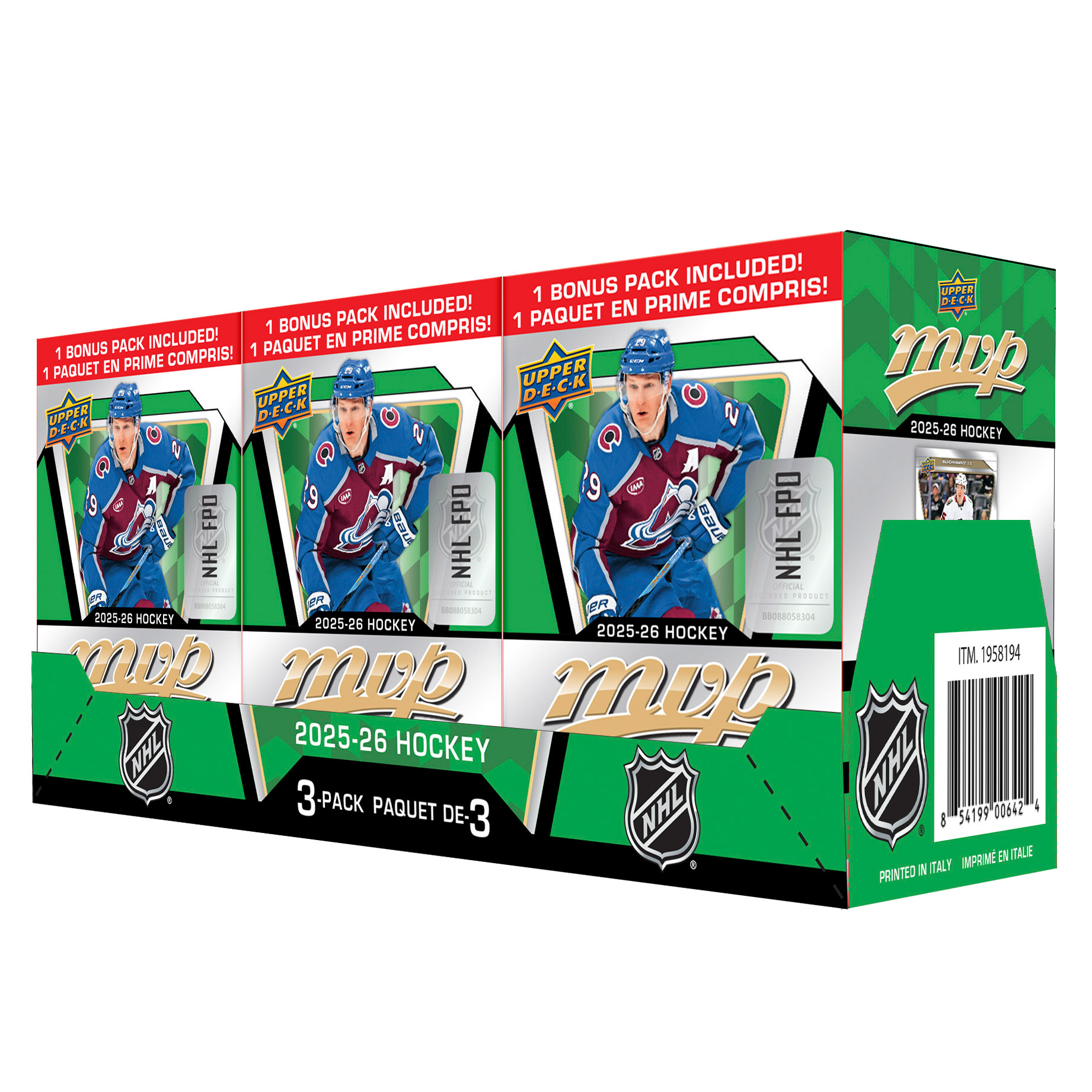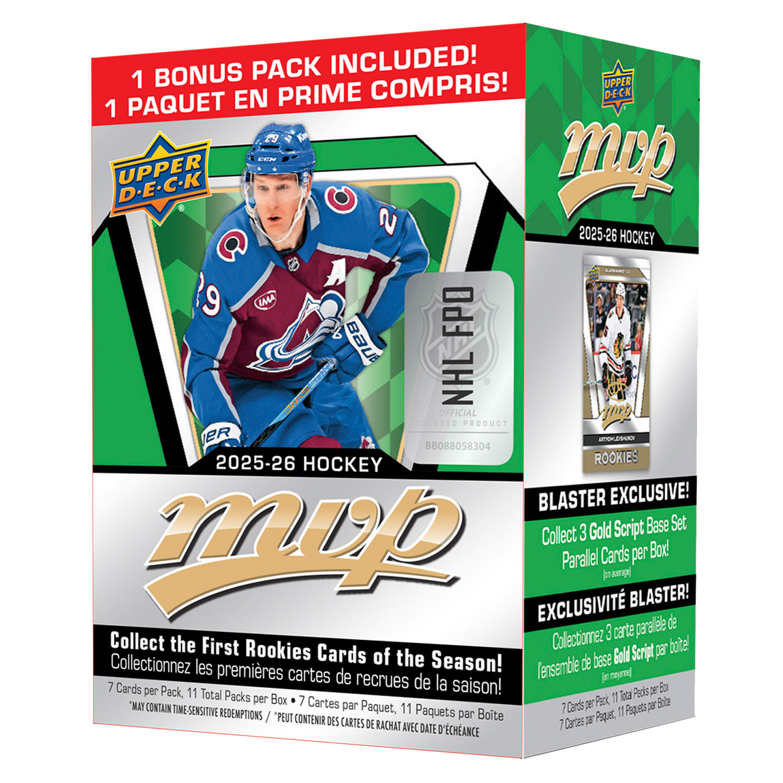 Your 2025-26 hockey card collection starts here! The latest edition of MVP Hockey features a 250-card Base Set – which includes 50 SP and Rookie cards, popular Base Set parallels, and a stellar lineup of new inserts sets. Additionally, each Blaster box contains a bonus pack containing three (3) exclusive Gold Script parallels of the Base Set!