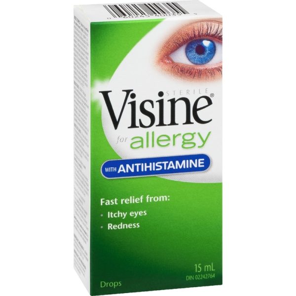 VISINE Advance with Antihistamine Allergy Eye Drops provides fast relief of eye allergy symptoms. This advanced formula combines the antihistamine, pheniramine maleate, to relieve itching and excessive tearing, and the decongestant, naphazoline hydrochloride, to relieve redness. The eye drops work effectively to relieve symptoms caused by allergies to pollen, trees, grass, ragweed, dust, pets, and mould. VISINE Advance with Antihistamine Allergy Eye Drops comes in a 15-millilitre bottle.