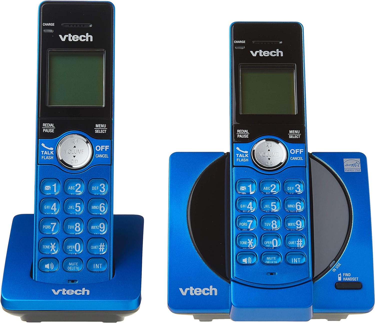 Dual handsets cordless phone system offers crystal clear conversations with interference free DECT 6.0 Technology. No interference with wireless networks and other electronic devices. With the touch of a button, the full duplex handset speakerphones makes hands-free conversations easy. Call block up to 20 of those unwanted telephone numbers. Entire keypad illuminates with LCD screen for easier viewing in dim light. Digital security protects against identity theft. Phone system also provides 30 name/number caller id/call waiting. 50 name/number phonebook, voicemail waiting indicator, trilingual prompts. Wall mountable. Intercom between handsets. Expandable up to five handsets with cs6909 accessory handset (sold separately). Color Blue.