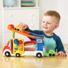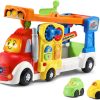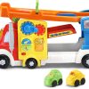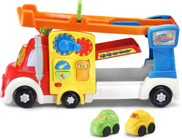 Tow and haul like a pro with the Go! Go! Smart Wheels big rig car carrier! The track at the top of this electronic semi-truck converts to a ramp that lets the included non-electric vehicles zigzag to the bottom. With spinning gears and a light-up windshield, this toy car carrier helps little truckers build fine motor skills. When you place a go! Go! Smart Wheels smart point vehicle (sold separately) on one of the two smart point locations, The vehicles will respond with sound effects, lights and music designed to keep your child engaged. When your child isn’t launching vehicles down the ramp, this interactive car carrier can haul and store up to three vehicles. Hit the road with the Go! Go! Smart Wheels big rig car carrier! Intended for ages 1-5. Requires 2 AAA batteries. Batteries are included for demo purposes only.